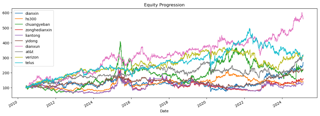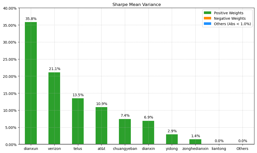 区间累计回报近5倍,最大回撤23.02%,投资组合的整体表现远好于中国电信个股。整个综合电信行业盈利能力较差,波动低,夏普比率0.93不算拔尖。(注:累计回报看Cumulative Returns那一栏,越高越好;最大回撤看Maximum Drawdown那一栏,越低越好)