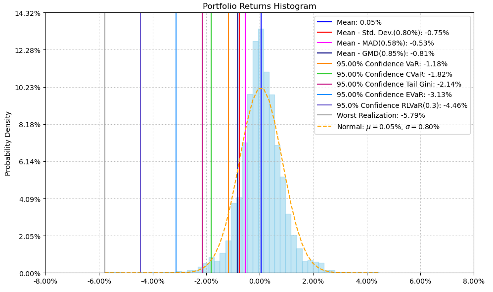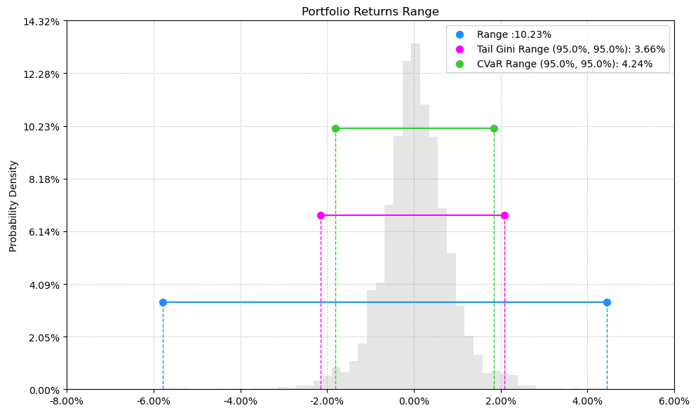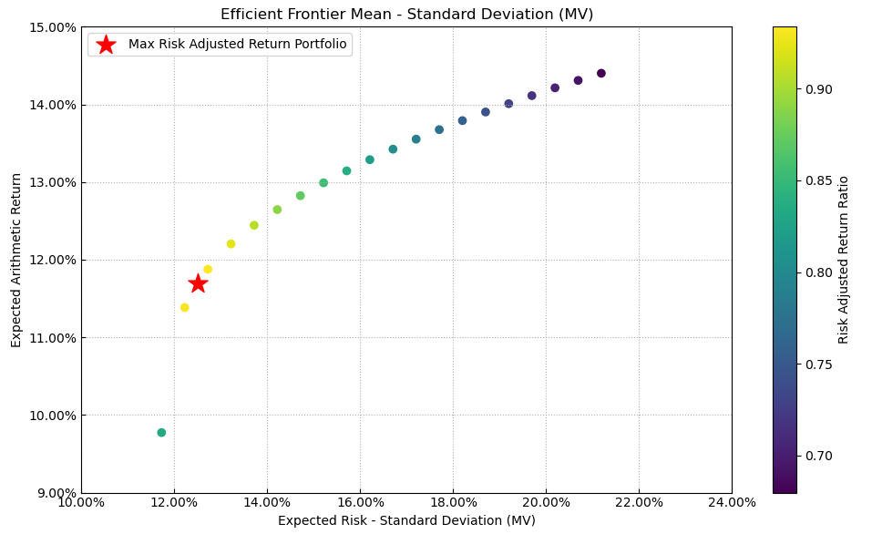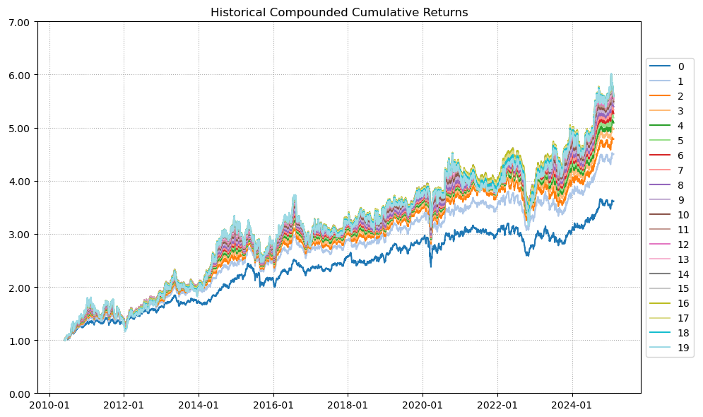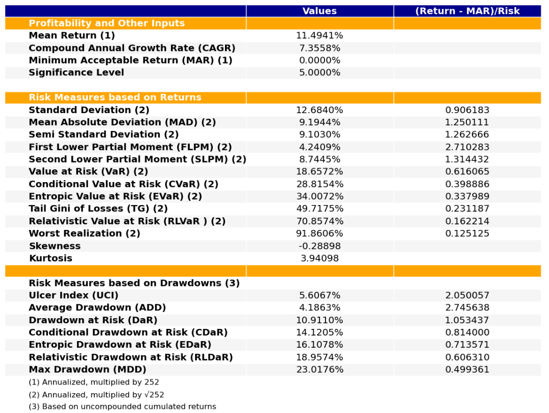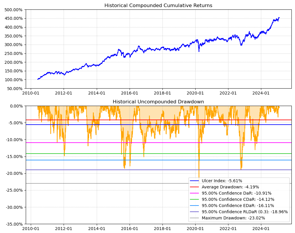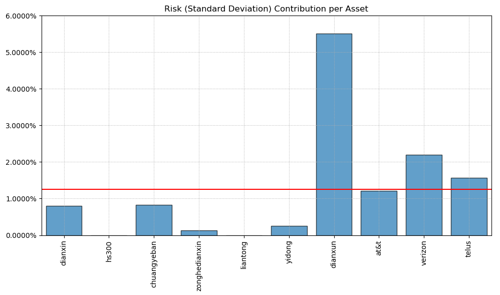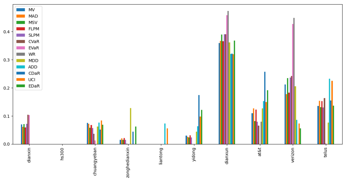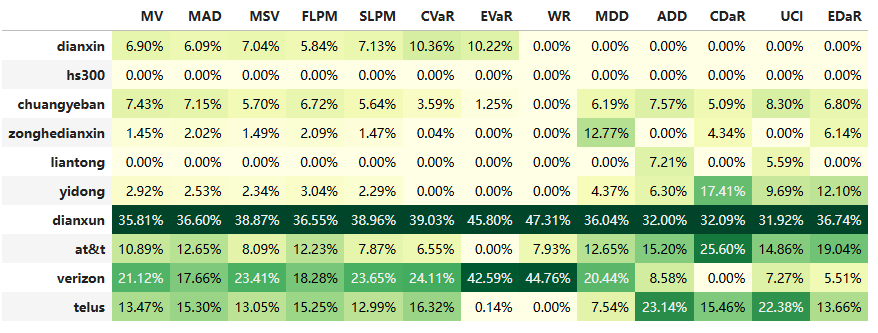 最后看下整个投资组合的情况,日度均值回报在0.05%,比上次测的电子元件行业低50%,不过4.24%的CVaR波动也会低近一半。(注:均值回报看Mean那一栏,越高越好;CVaR波动看CVaR那一栏,越低越好)