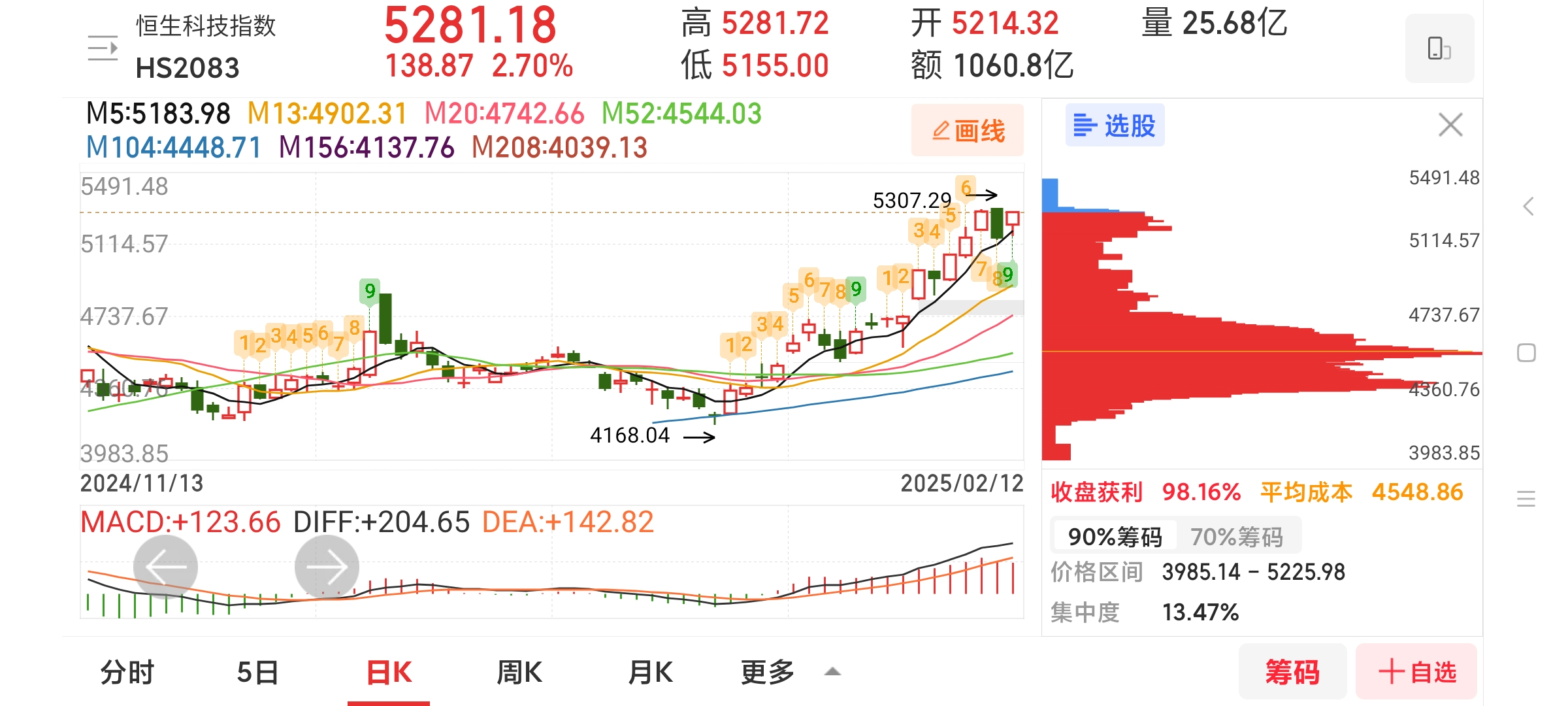 再来看看受deepseek较大影响的港股通互联网,20月线是712点,20周线是816点,20日线是803点,收盘913点,收在所有均线之上,收在布林线上轨之上,收20日布林线上轨之下,说明短期受阻乏力,中期仍可期待。港股通互联网年涨幅14%