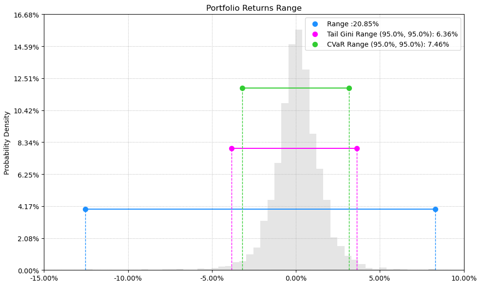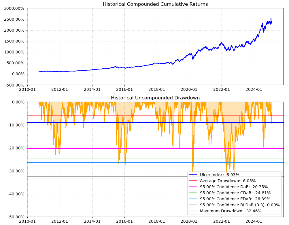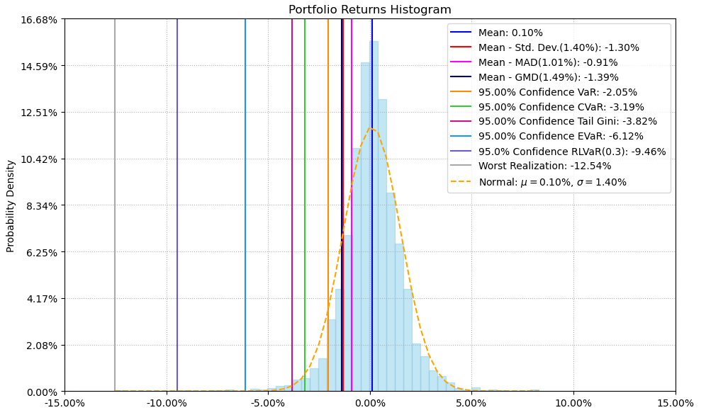 最后看下整个投资组合的情况,日度均值回报在0.10%,比上次测的综合电信行业高100%,不过7.46%的CVaR波动也会高一些。(注:均值回报看Mean那一栏,越高越好;CVaR波动看CVaR那一栏,越低越好)