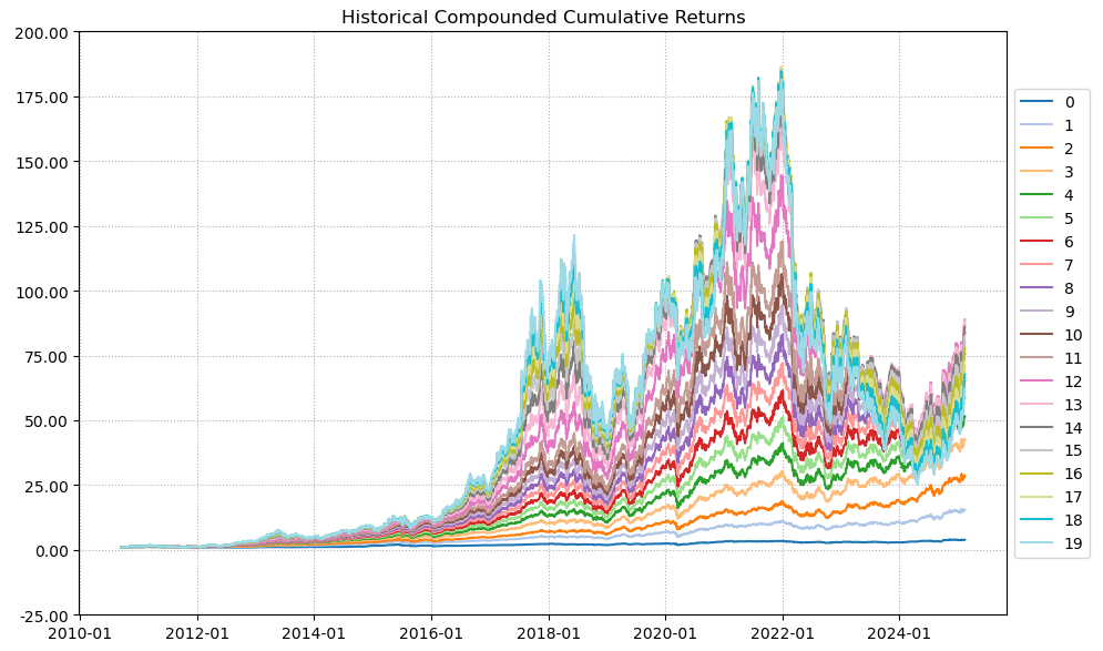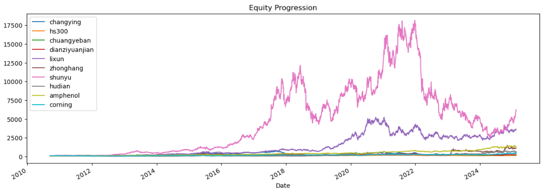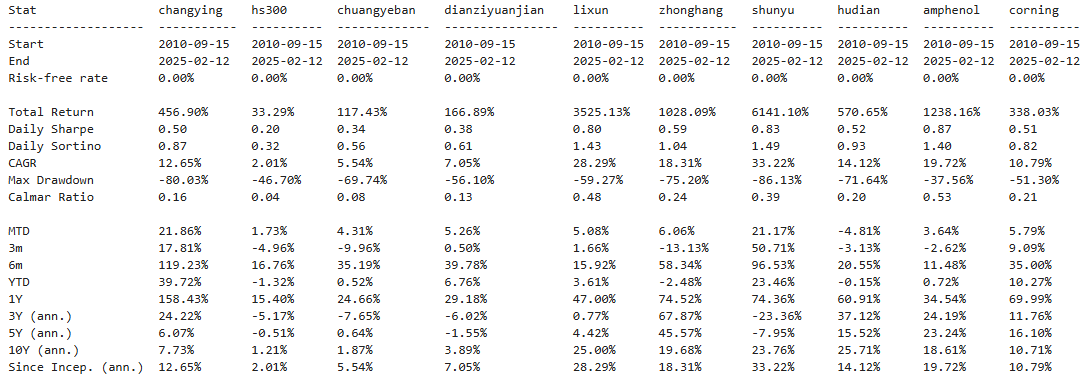 区间累计回报近25倍,最大回撤32.46%,投资组合的整体表现远好于长盈精密个股。整个电子元件行业盈利能力优秀,波动中等,夏普比率1.28极其诱人。(注:累计回报看Cumulative Returns那一栏,越高越好;最大回撤看Maximum Drawdown那一栏,越低越好)