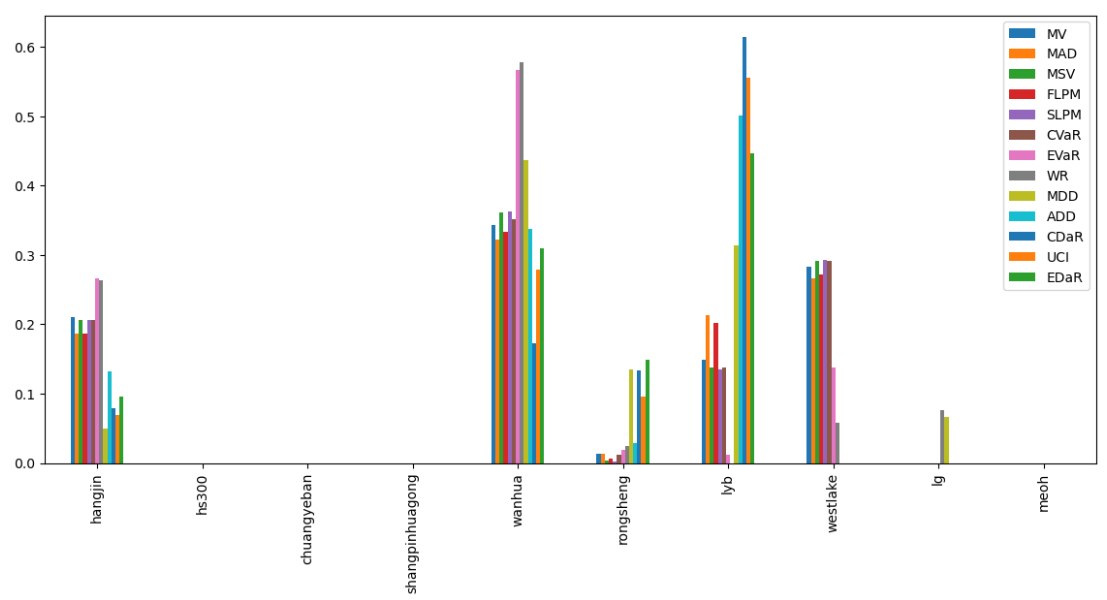 如果换成其他约束,系统给的配置比例也大同小异,基本是在万华化学和美股的WESTLAKE之间做取舍了。(注:占比越高越好)