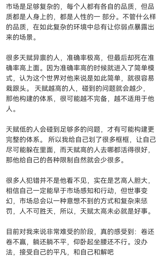 信息茧房、认知偏见、傲慢和胜心害了我,可能与我父亲目中无人的性格有关。人终归是渺小的。我现在想努力改变自己看问题的习惯,毕竟任何观点都有几分是处。