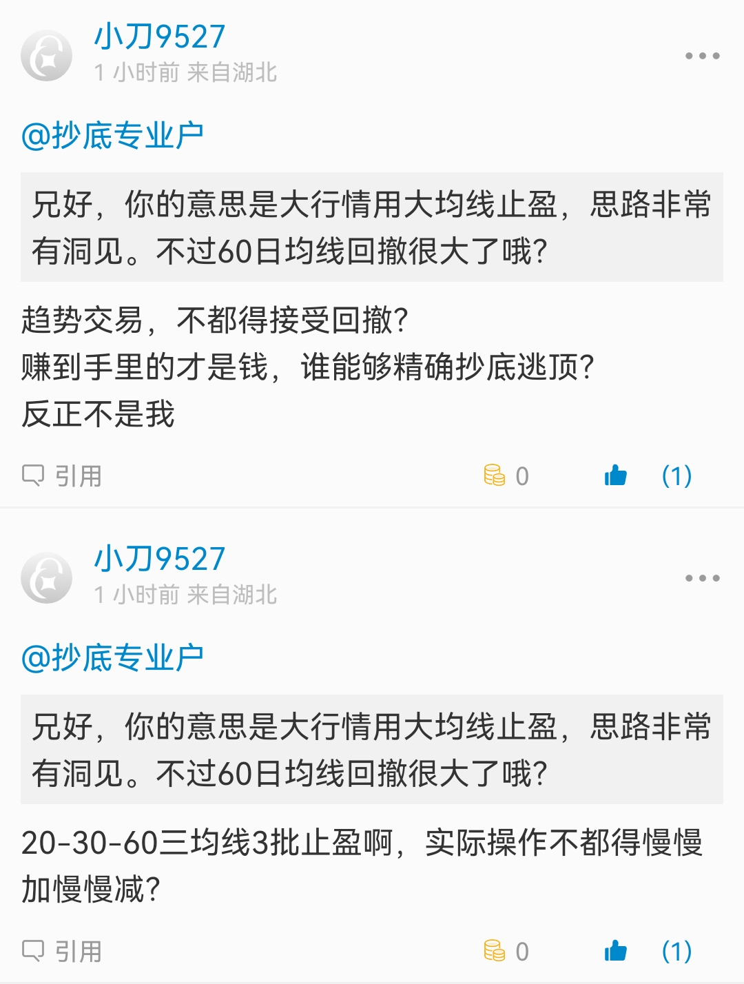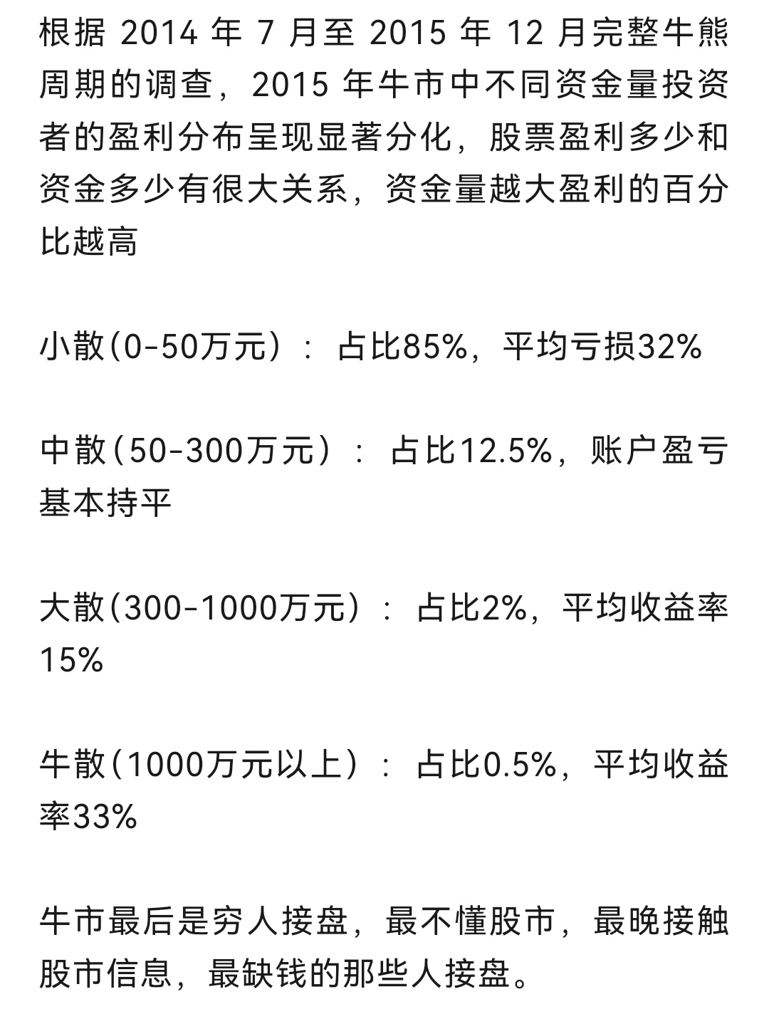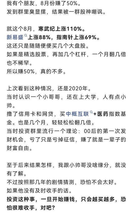 韭菜无知者无畏!赚了点就自信,自信就后悔当初仓位小了,于是越涨越加杠杆。一个回调就会把利润打回去,然后就是等利润回到巅峰,但总有一次是空等,等来的都是套在顶部。