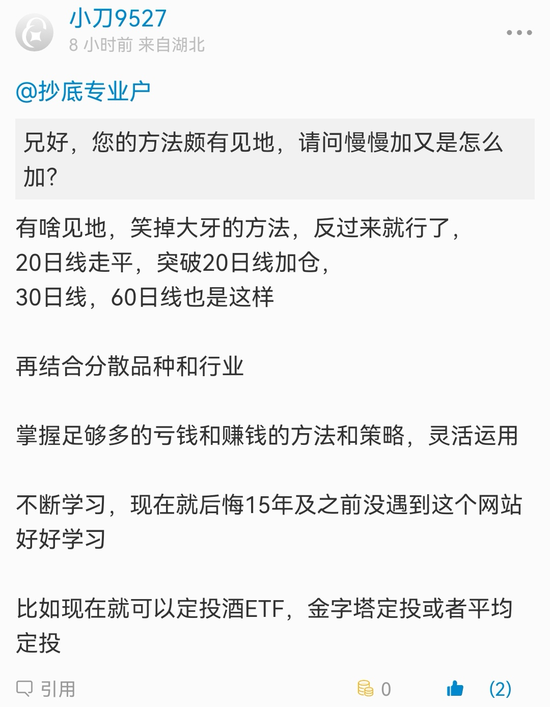 5. 加仓:加仓不要太急,单个品种仓位达到一定量就必须停止加仓,买入其它低估品种,其它品种得手了一样是赚钱。