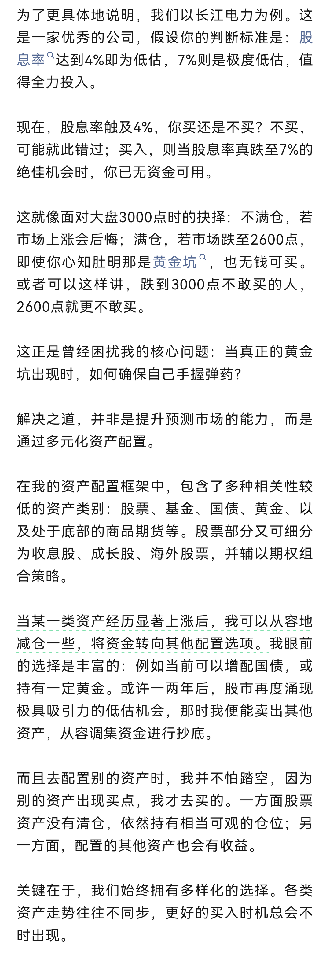 控制好仓位,大跌就是机会。也有可能大盘大跌,低估资产只是小跌,甚至小跌后就走出独立行情。各大品类仓位都不要太重,哪个大类资产出现系统性风险,也就意味着系统性机会。