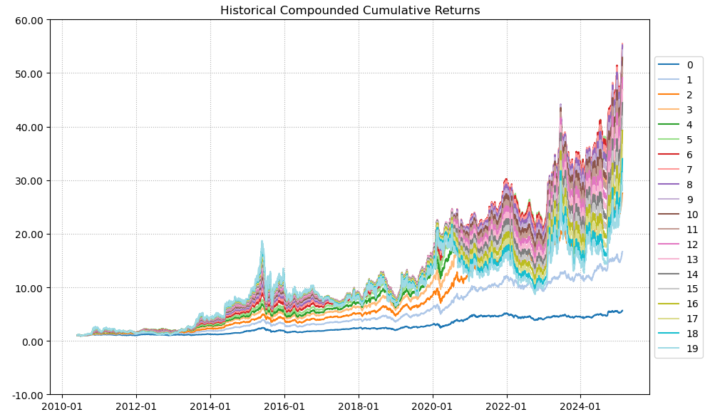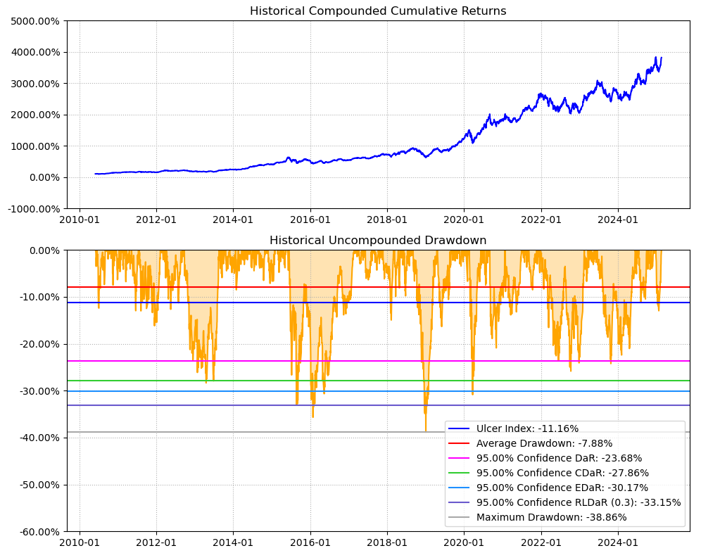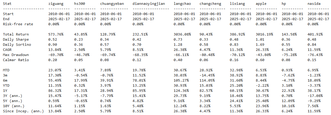 区间累计回报近40倍,最大回撤38.86%,投资组合的整体表现远好于紫光股份个股。整个电脑硬件行业盈利能力优秀,波动不大,夏普比率1.24堪称卓越。(注:累计回报看Cumulative Returns那一栏,越高越好;最大回撤看Maximum Drawdown那一栏,越低越好)