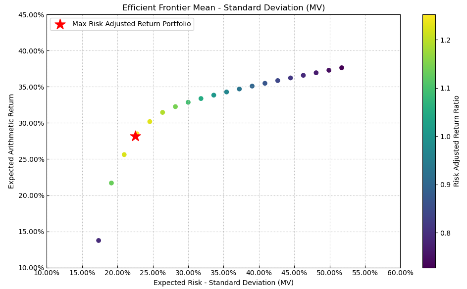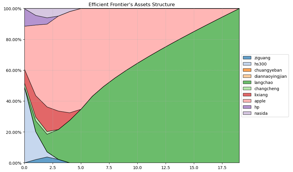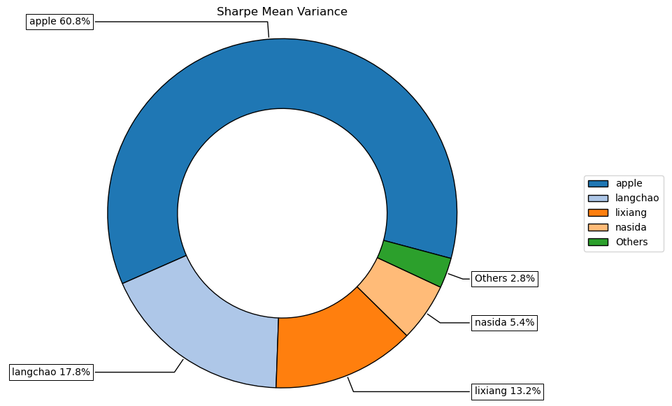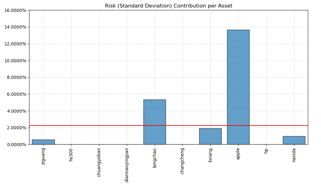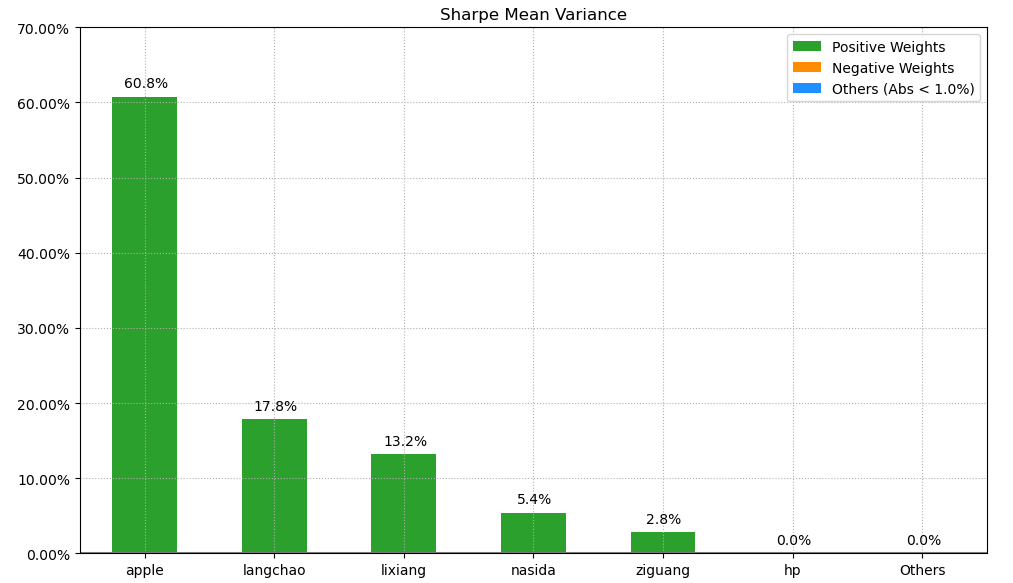 按最高夏普比率配置的话,系统给的权重为2.8%,最大权重给了美股的苹果占比60.8%。(注:占比越高越好)
