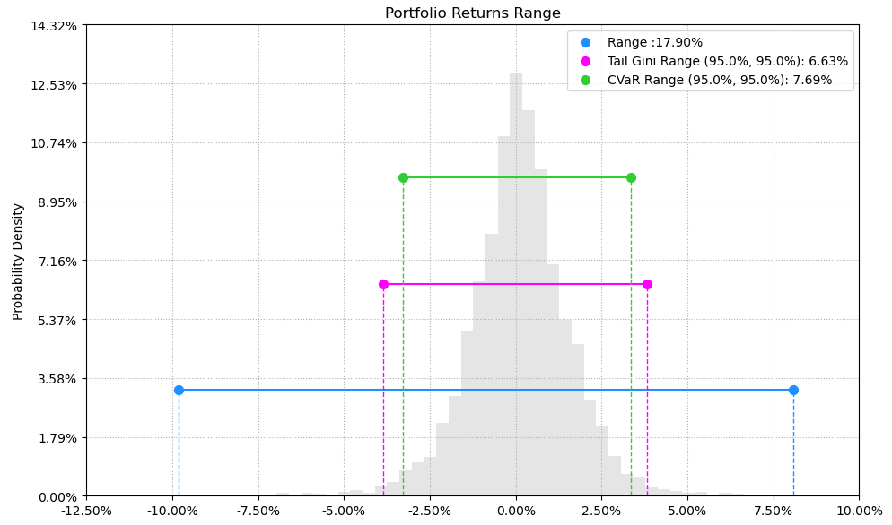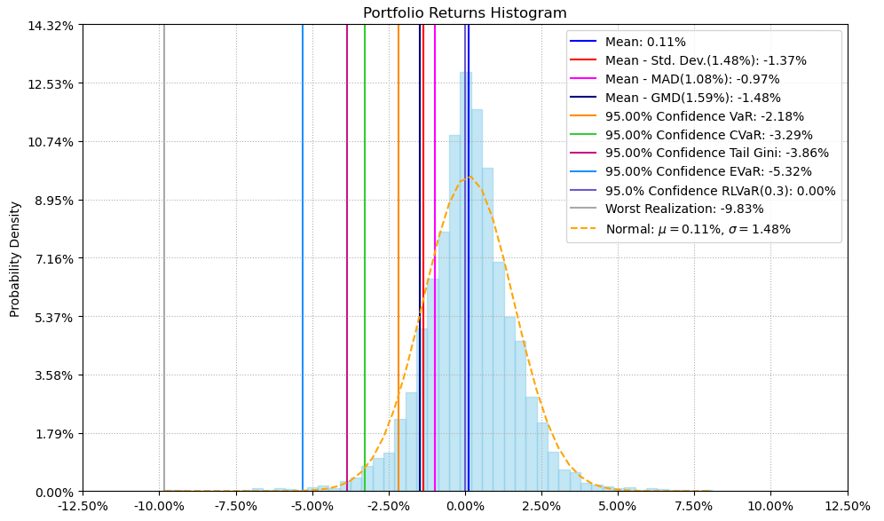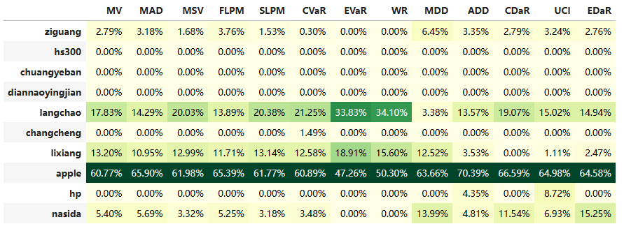 最后看下整个投资组合的情况,日度均值回报在0.11%,比上次测的应用软件行业低10%,不过7.69%的CVaR波动也会小很多。(注:均值回报看Mean那一栏,越高越好;CVaR波动看CVaR那一栏,越低越好)