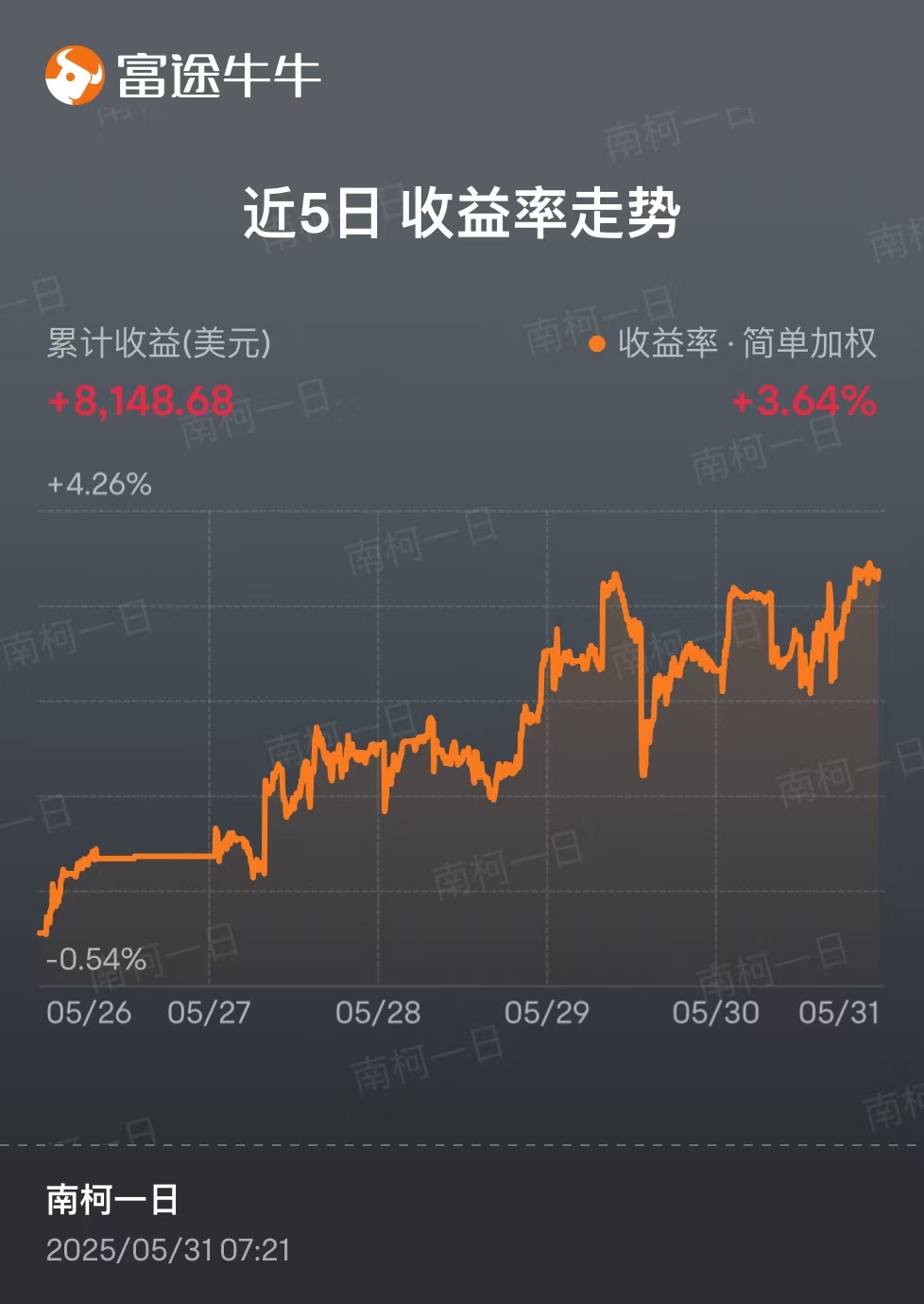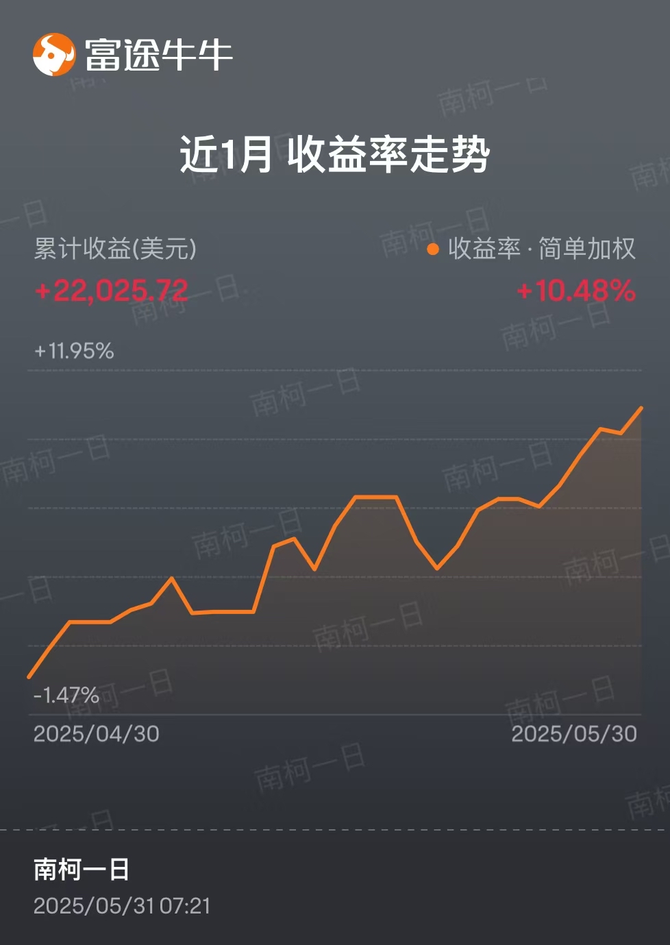5 月总体还是得益于美股反弹,20 号以后基本出清了持仓的 TQQQ 和英伟达