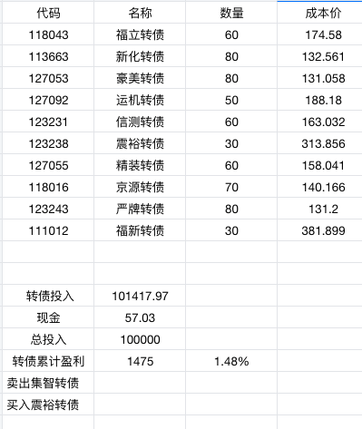 反思:今日亏损来自港股宽跨,饼子今天有调仓,但朗科是我之前买的,如果按饼子开始的时间算是赚钱的,按成本算是亏钱的,就按不亏不赚算了。也没卖,转股套溢价去了。