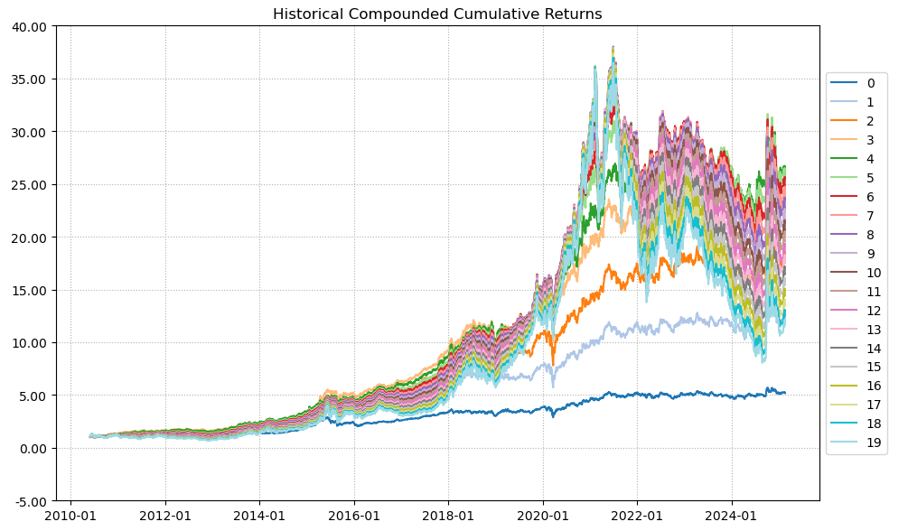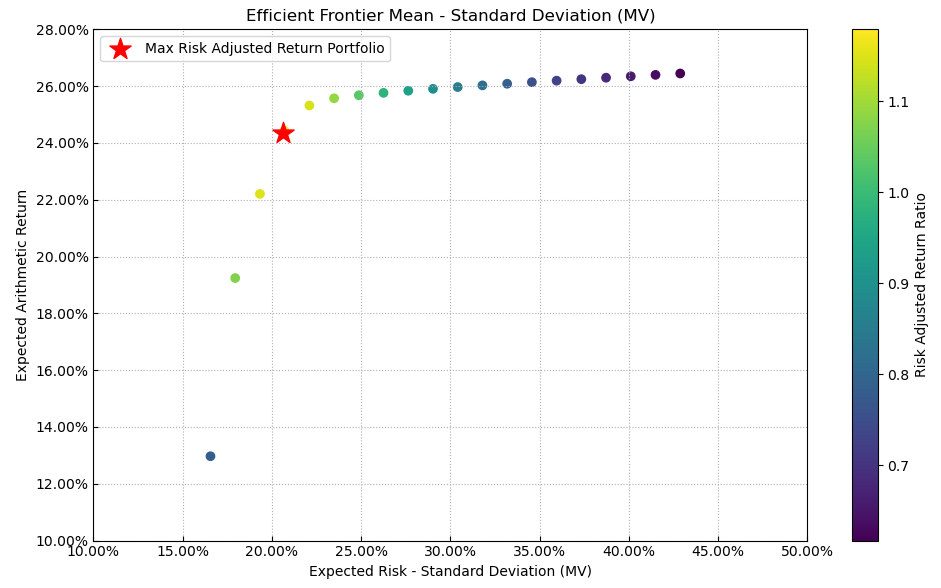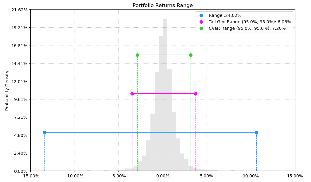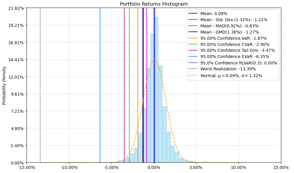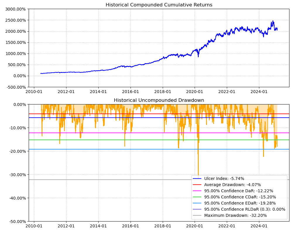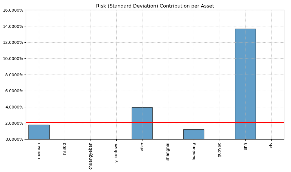 最后看下整个投资组合的情况,日度均值回报在0.09%,比上次测的电脑硬件行业低20%,不过7.20%的CVaR波动也会小一些。(注:均值回报看Mean那一栏,越高越好;CVaR波动看CVaR那一栏,越低越好)