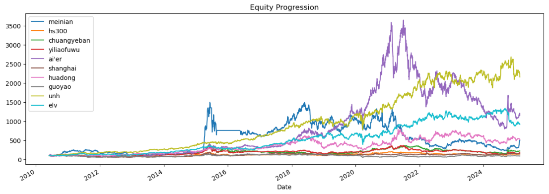区间累计回报近25倍,最大回撤32.2%,投资组合的整体表现远好于美年健康个股。整个医疗服务行业盈利能力还行,波动小,夏普比率1.18优秀。(注:累计回报看Cumulative Returns那一栏,越高越好;最大回撤看Maximum Drawdown那一栏,越低越好)