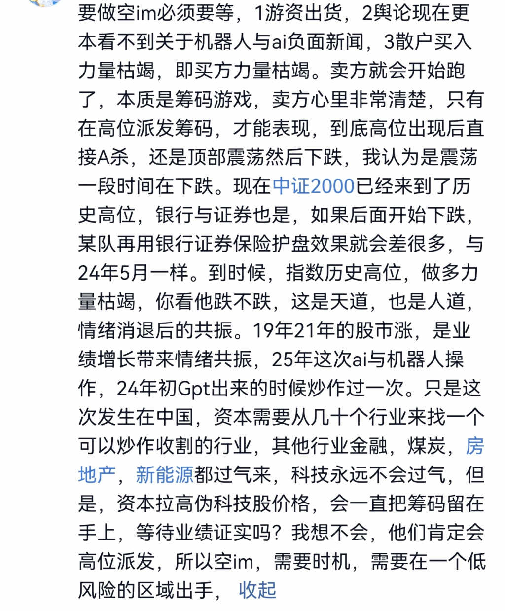中证1000指数从2021年11月30日最高点8082点开始下跌,跌到2024年9月底,整整跌了34个月,理论上,一个指数跌多长时间,涨就能大致涨差不多时间,中证1000指数去年9月底涨到现在才涨了5个多月,不可能涨这么短时间就出现反转下跌,未来1年内,中证1000要跌破半年均线很难,现在半年线在5900多点,再过10个交易日左右就到6000点,现在贴水这么大做空,要做到不亏钱抽身,非常难,加杠...同感,现在贴水的空头,要不了几天就踩踏。去年定价框架的胜率,成了多头今年逆袭的赔率,贴水就相当于送打折筹码。