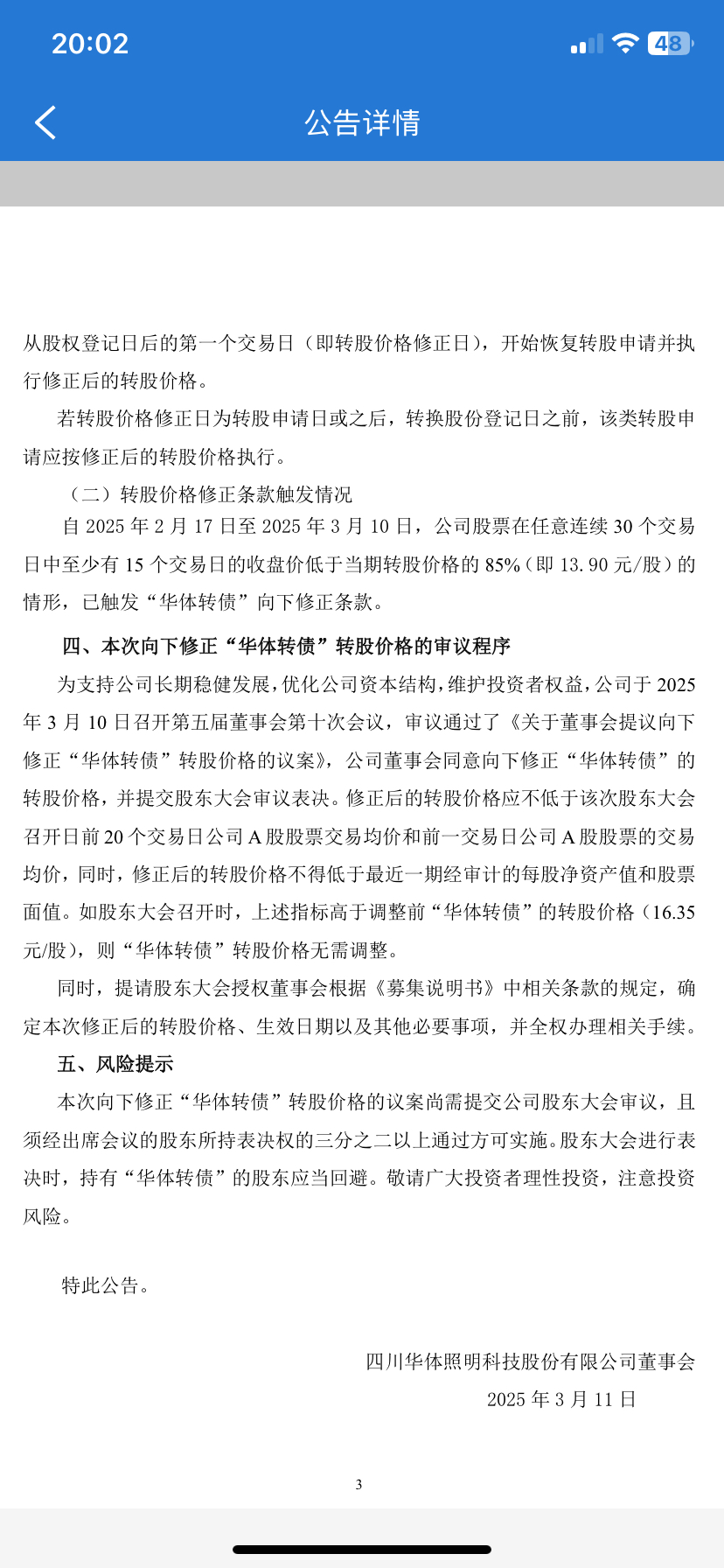 华体转债和上次一样基本下修到底,转股价格由16.35元/股向下修正为13.49元/股。前20个交易日均价是13.48元,下修到13.49元,2月前上次下修也是留一分,估计公司迷信做事留一分。连续2次下修到底说明公司促进可转债转股(强赎回化债)态度坚决!