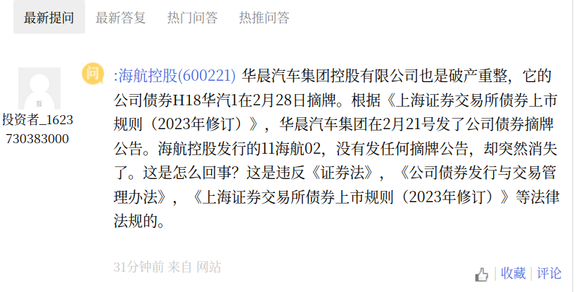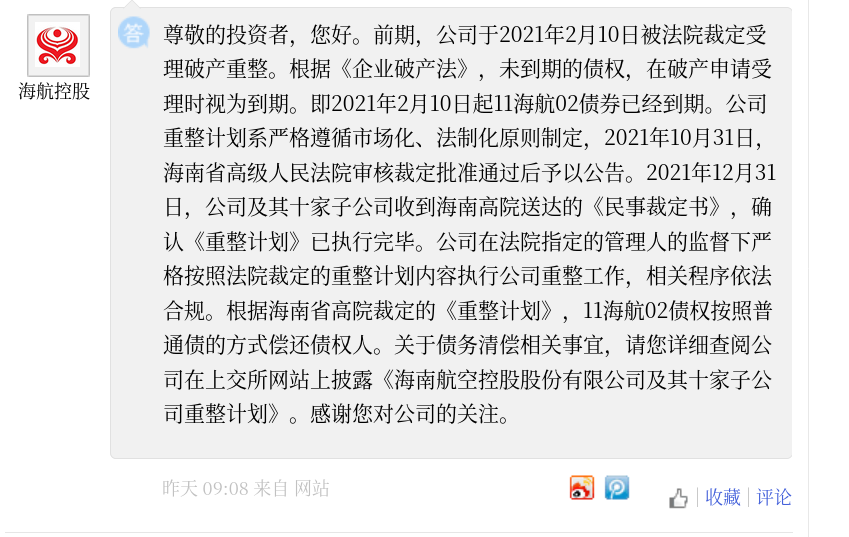 海航控股的11海航02没有发任何摘牌公告,就突然消失了。法律法规,制度程序,对海航控股来说,啥也不是,它可以任意行事。一个公司可以破坏整个债券市场,这个简直匪夷所思。