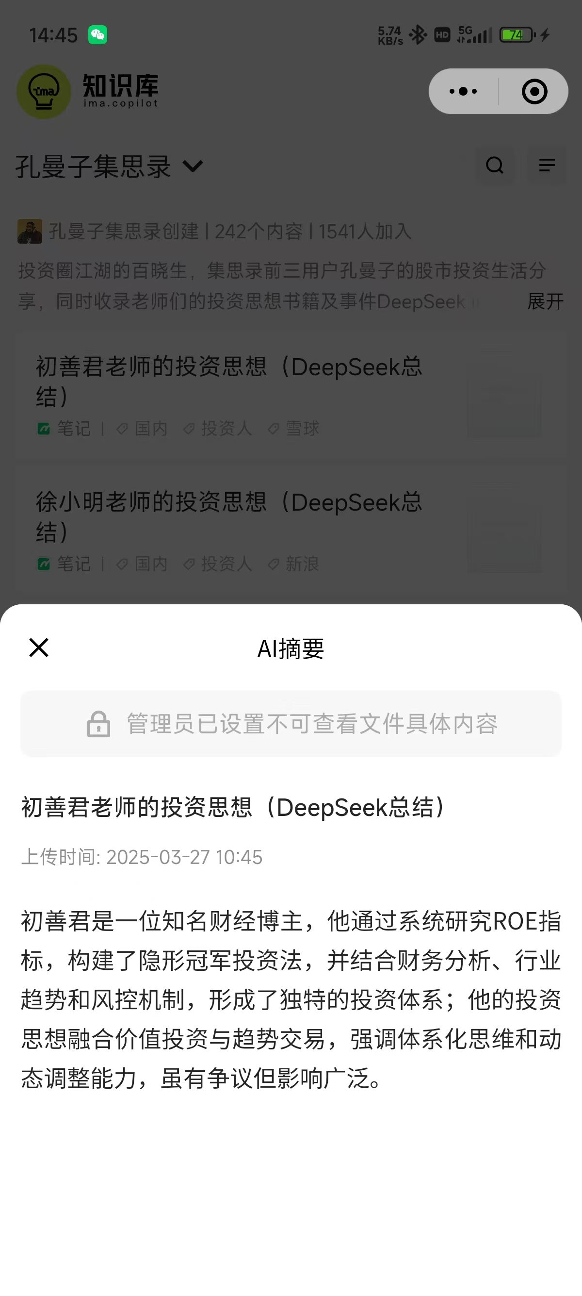 不好意思,”孔曼子集思录“这个知识库,只能通过基于知识库提问的方式来获取知识库内容。知识库也是创建者劳动的成果,如果直接允许查看和下载内容的话,只要几分钟就被复制了。如果复制者再坏一点,把孔曼子和其他老师的ID都替换为自己的名字,影响就更不好了。我这几天加入并学习了不少的知识库,基本都是这样设置的。