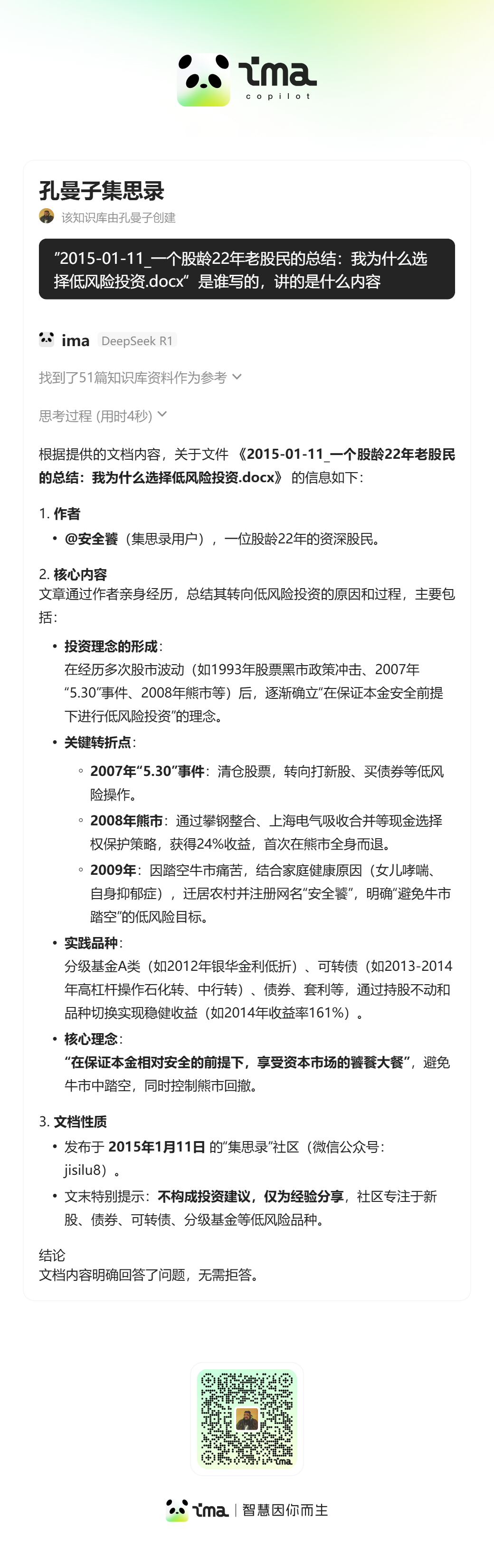 举一个提问的例子吧。从文件名列表中,可以看到有一个”2015-01-11_一个股龄22年老股民的总结:我为什么选择低风险投资.docx“ 。
