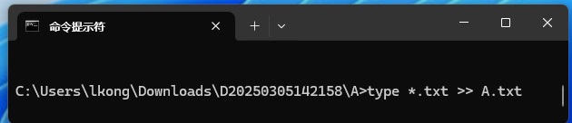 3. 合并各文件夹下的txt文件。我是用CMD进入文件夹,再用type *.txt >>A.txt 合并的。python或工具软件等其他方式应该也是可以的。