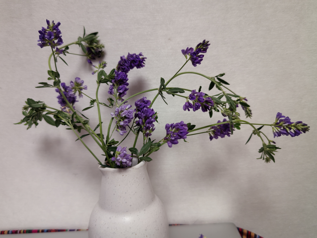 端午假期,早市里很多人举着艾草,很有节日感。我也做好了自己的艾草花束挂在门口。还从视频里学到的,用紫花荆芥扎了小花束放在冰箱里。今天公园游,看到不认识的水鸟在那吞鱼,新出生的小鸊鹈在潜水,湖里的野鸭子很闲适地趴在树桩上睡觉。听到割草机在那突突,也麻利地抢收了几枝紫花苜蓿,第一次插瓶这样的野花,很美。