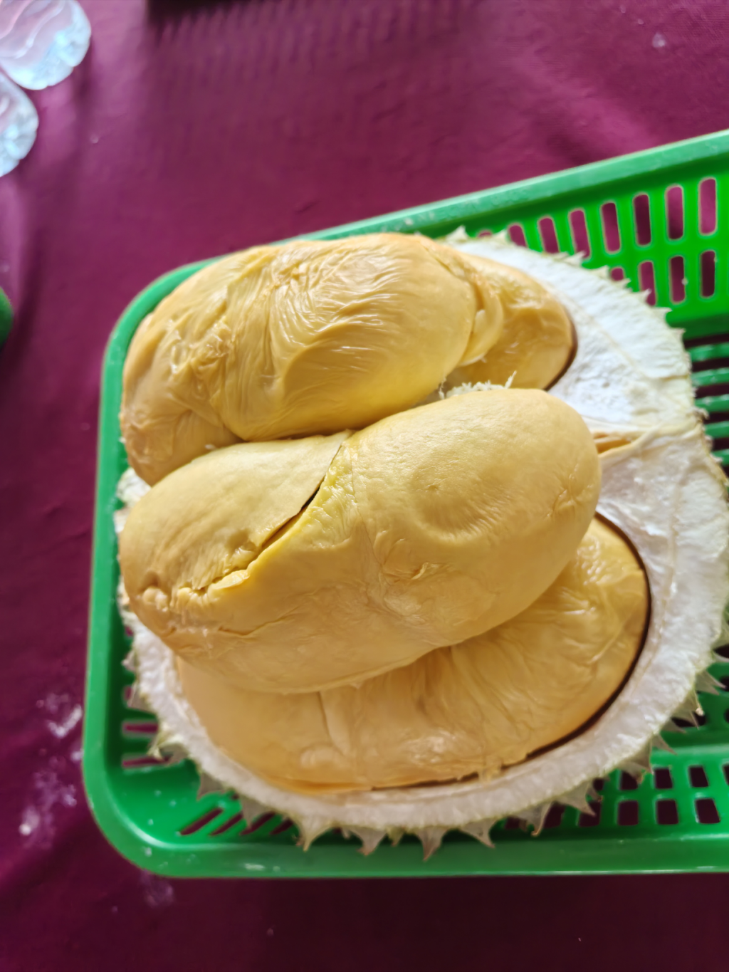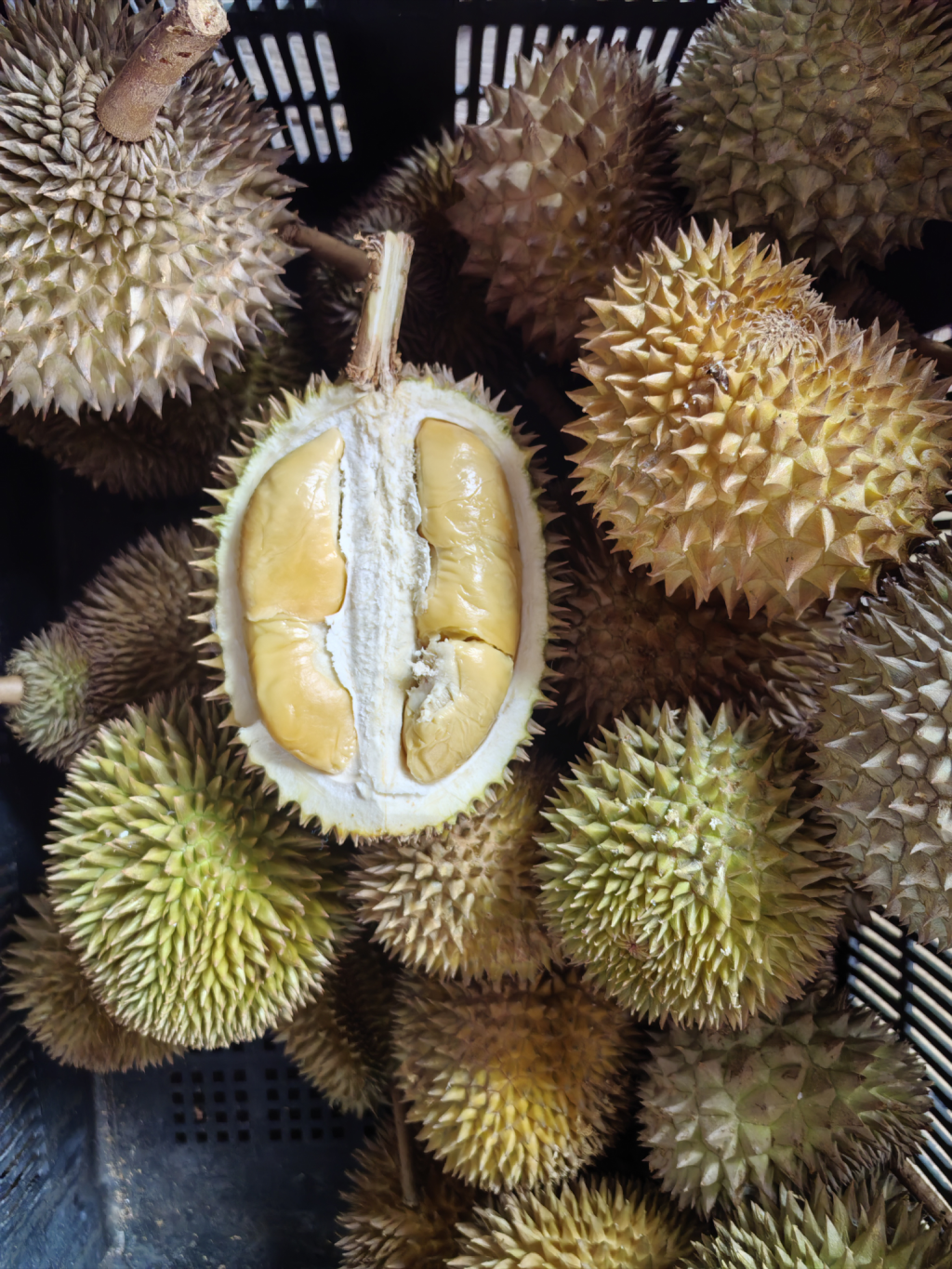 那个绿筐子里的榴莲太漂亮了。连我平常不大喜欢吃榴莲的都觉得看到了绝对得买回家。