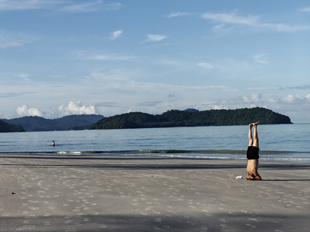 早起,沿着沙滩徒步,看到有一拨女士上瑜伽课的,身材都很棒,感慨了下。回途看到这位更厉害,等我走过他才站回身,是位印度老大爷。