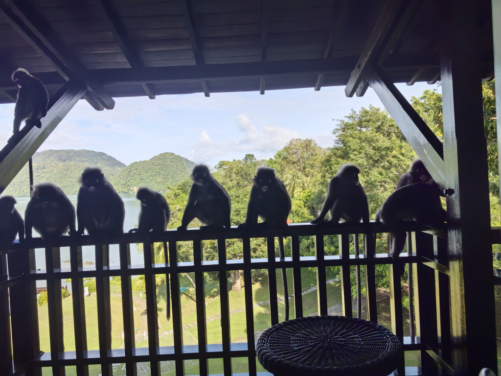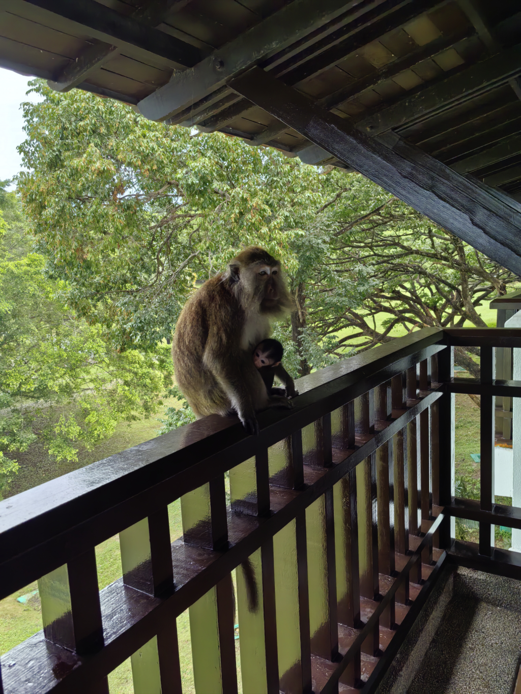 吃完早餐回酒店,一眼发现露台晾的衣服都被扔地上了。一下子想起昨天酒店小哥提醒要锁好露台门,猴子们会迅速进来。果然,我推门出去收衣服,听到动静的猴哥们立马集结过来。