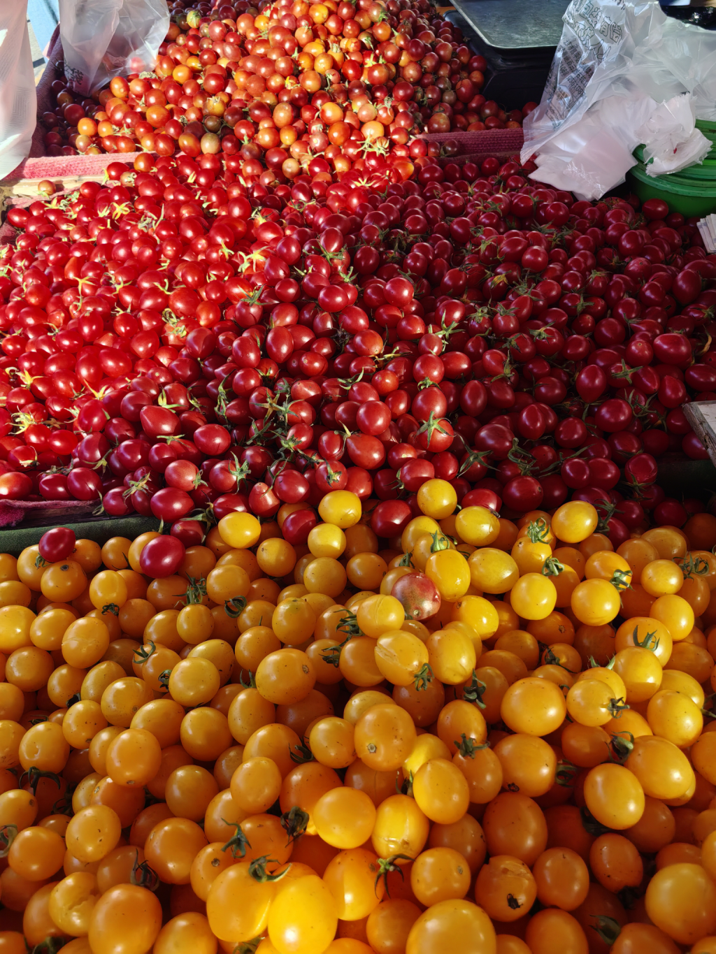 本周仓位八层,年16.5%,还在原地踏步。今日早市事事如意篇。每次去早市,都感觉天南海北的物产,丰饶俱足,都不清楚在地产的果蔬。今天,特意寻觅了下,找到了小汤山的小西红柿,得有七八种颜色,每个颜色都是不同味道。看大家集中挑橙色的,就知道那个最甜。在水产区,很多人在挑兰花蟹,想着也应该肥了,又没买,做起来不费事,可家里人都觉得吃起来费事。带鱼银亮银亮的,一致决定买带鱼,体验初开海的新鲜。