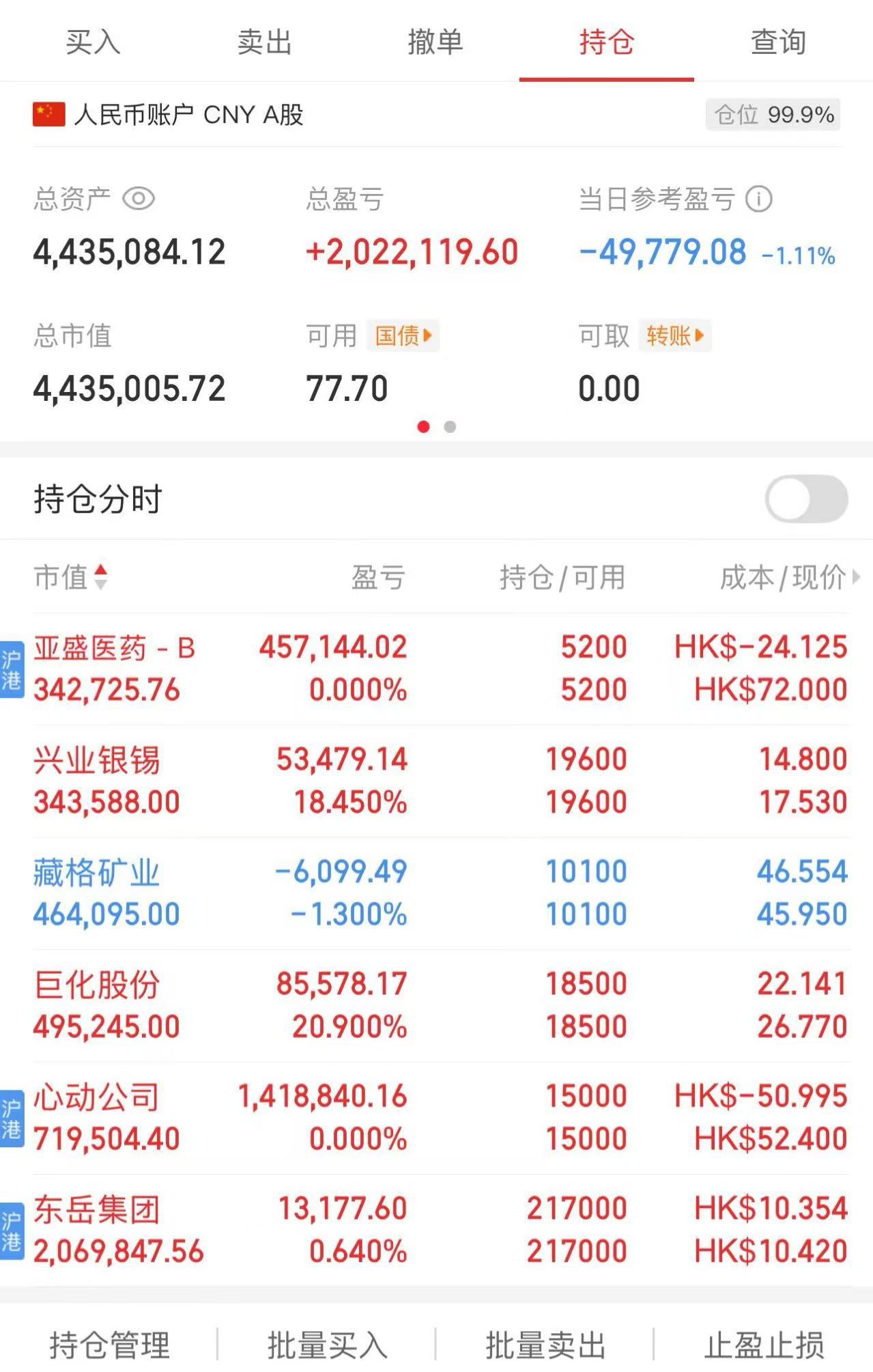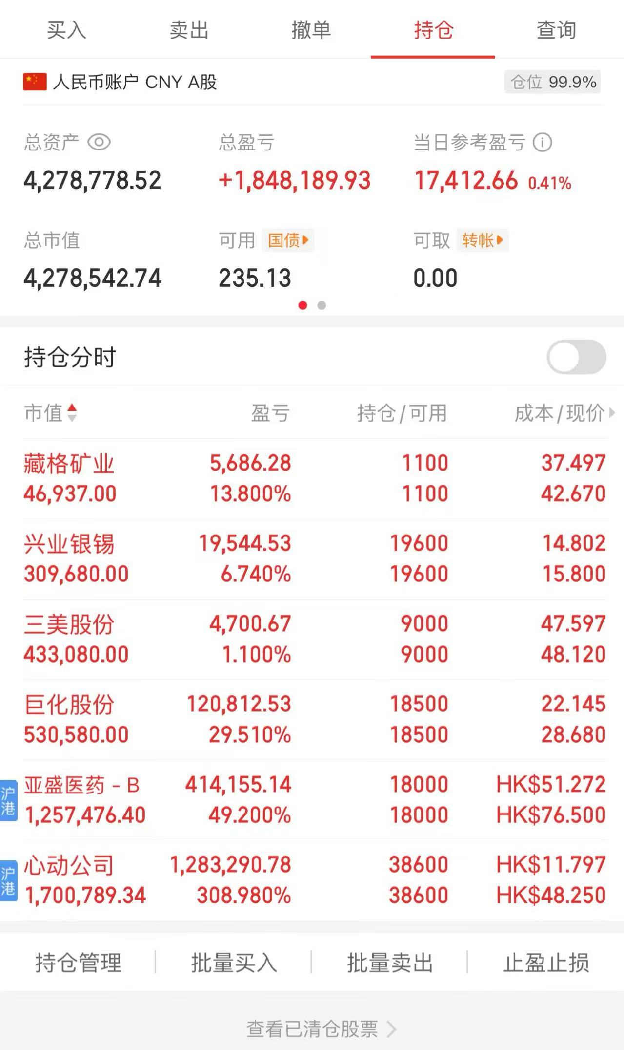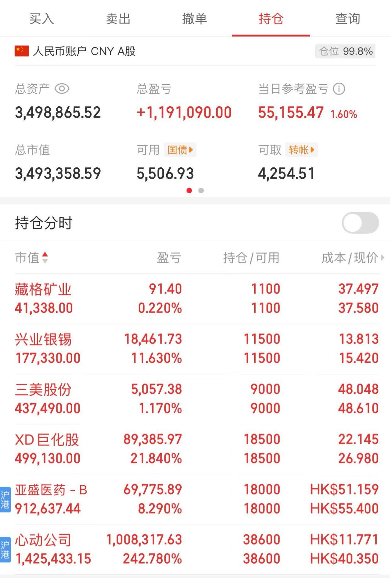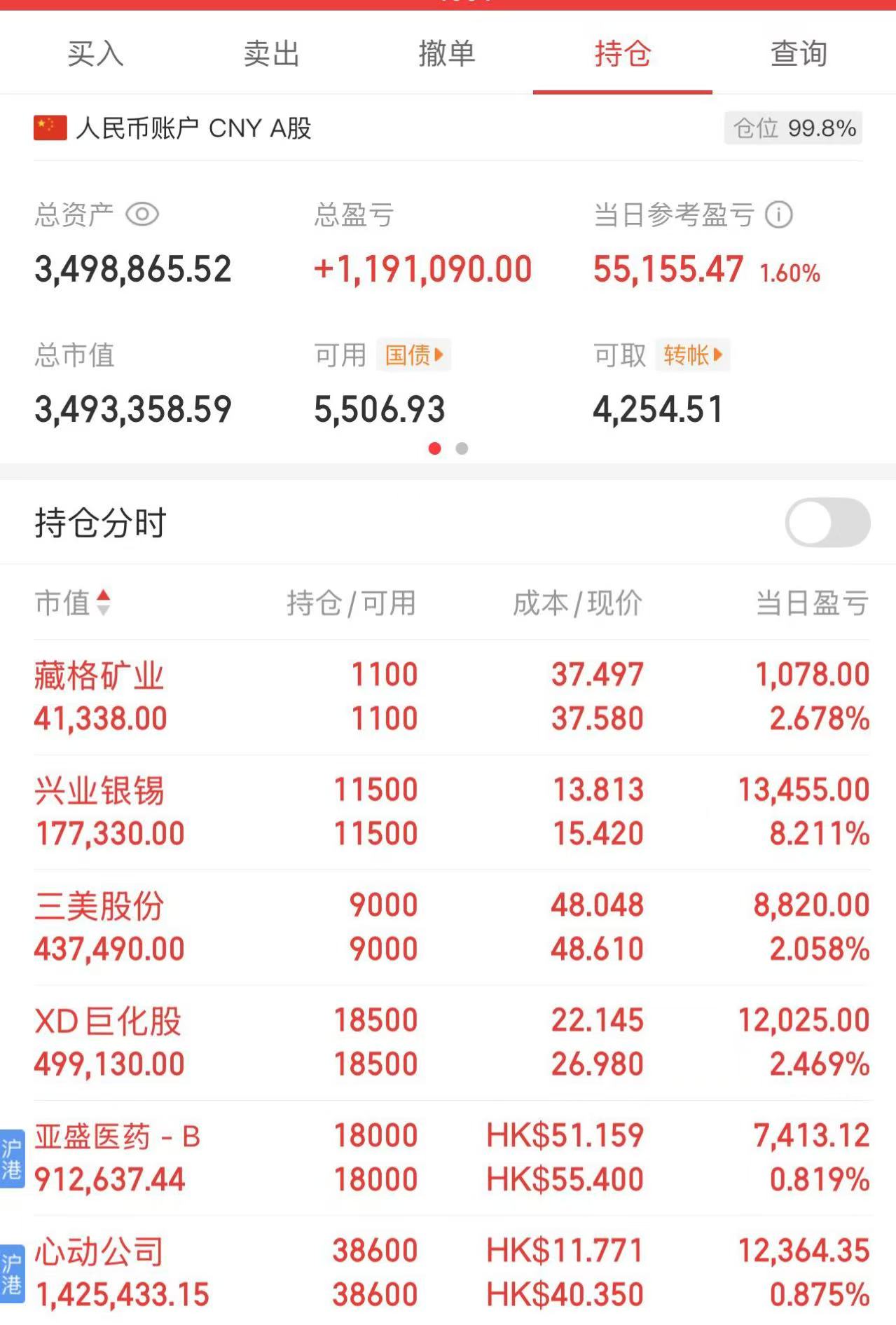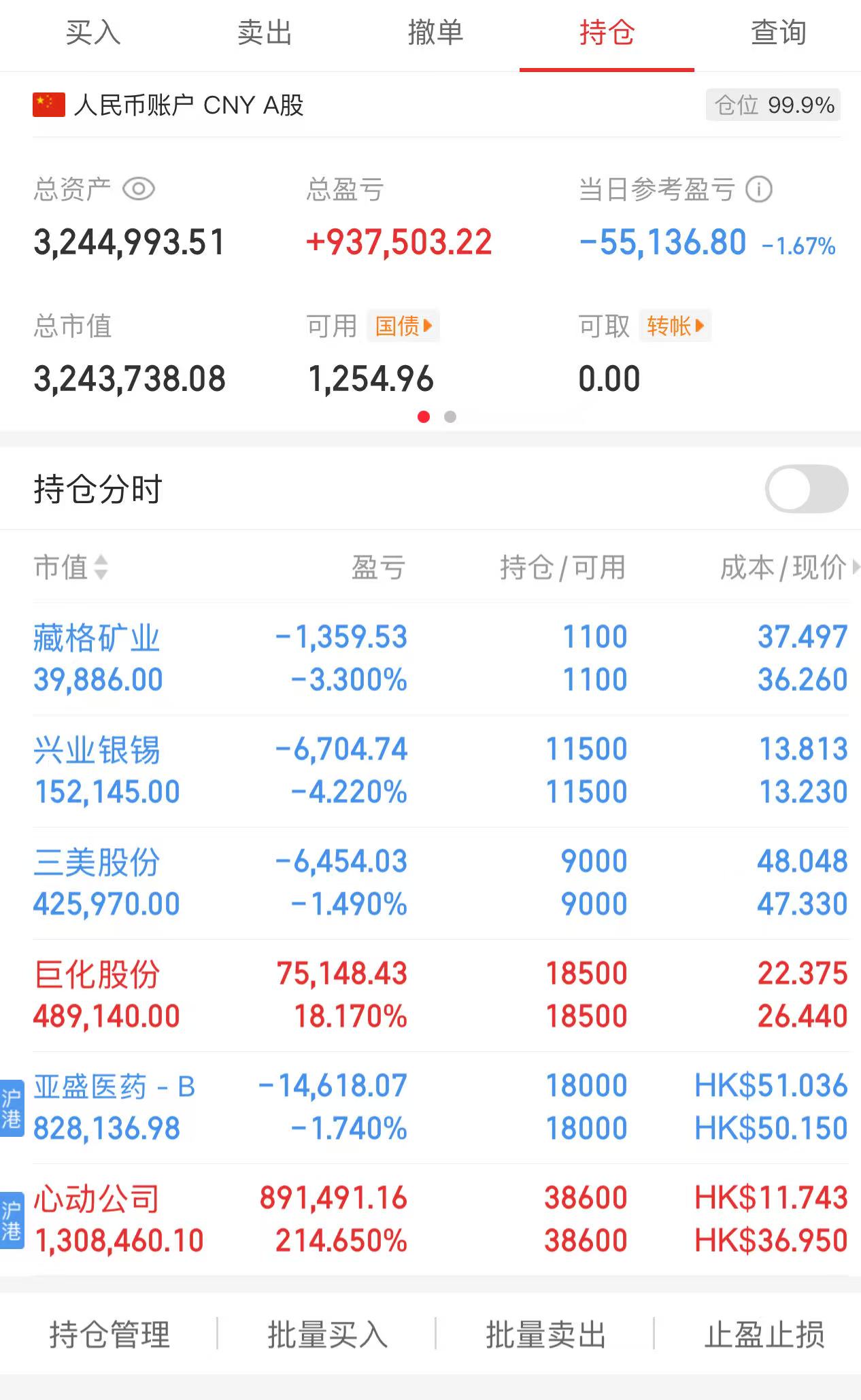 今天加了20万,这是我最后的倔强了,虽然还有一些现金流,但从今天开始,不会再往股市里增投一分钱了。目前持仓如下: