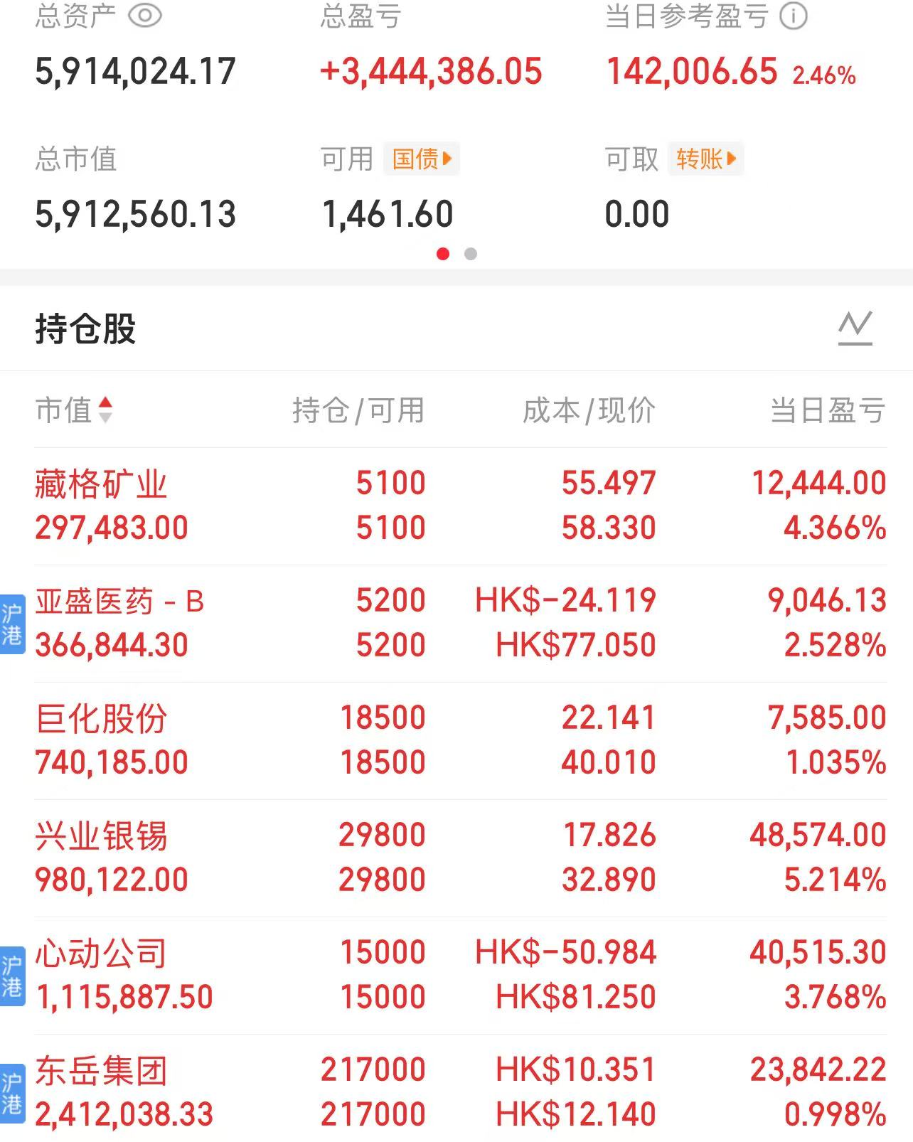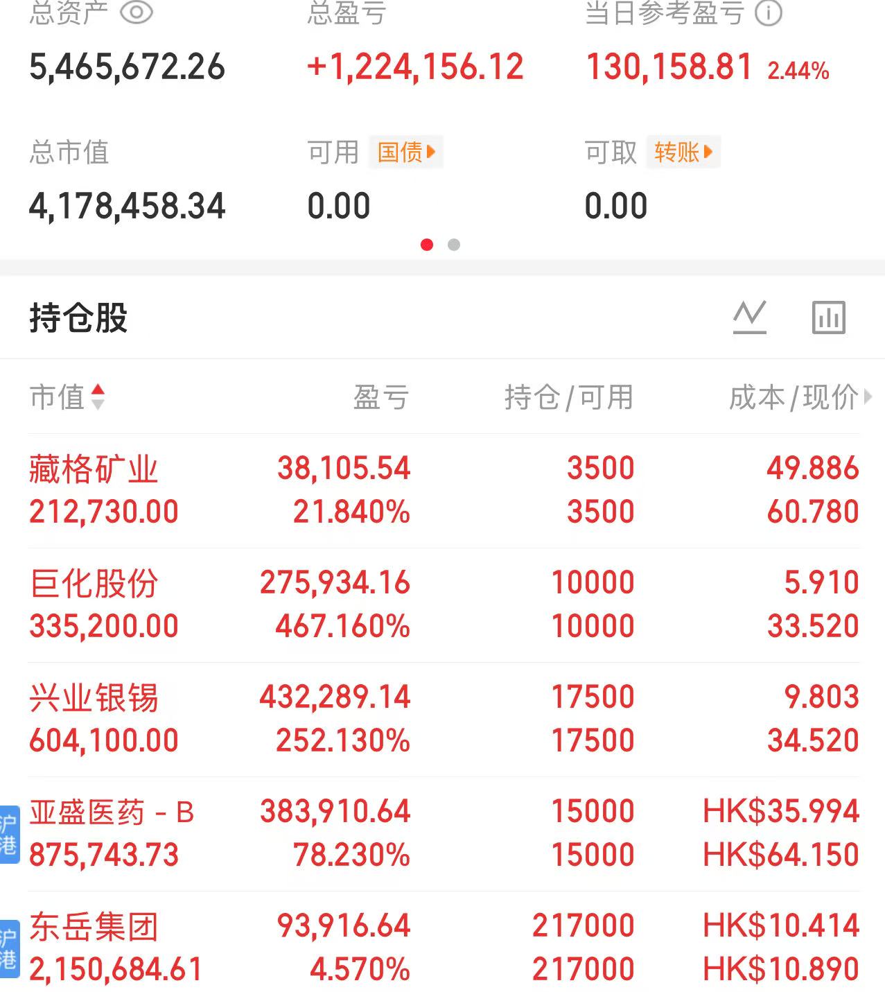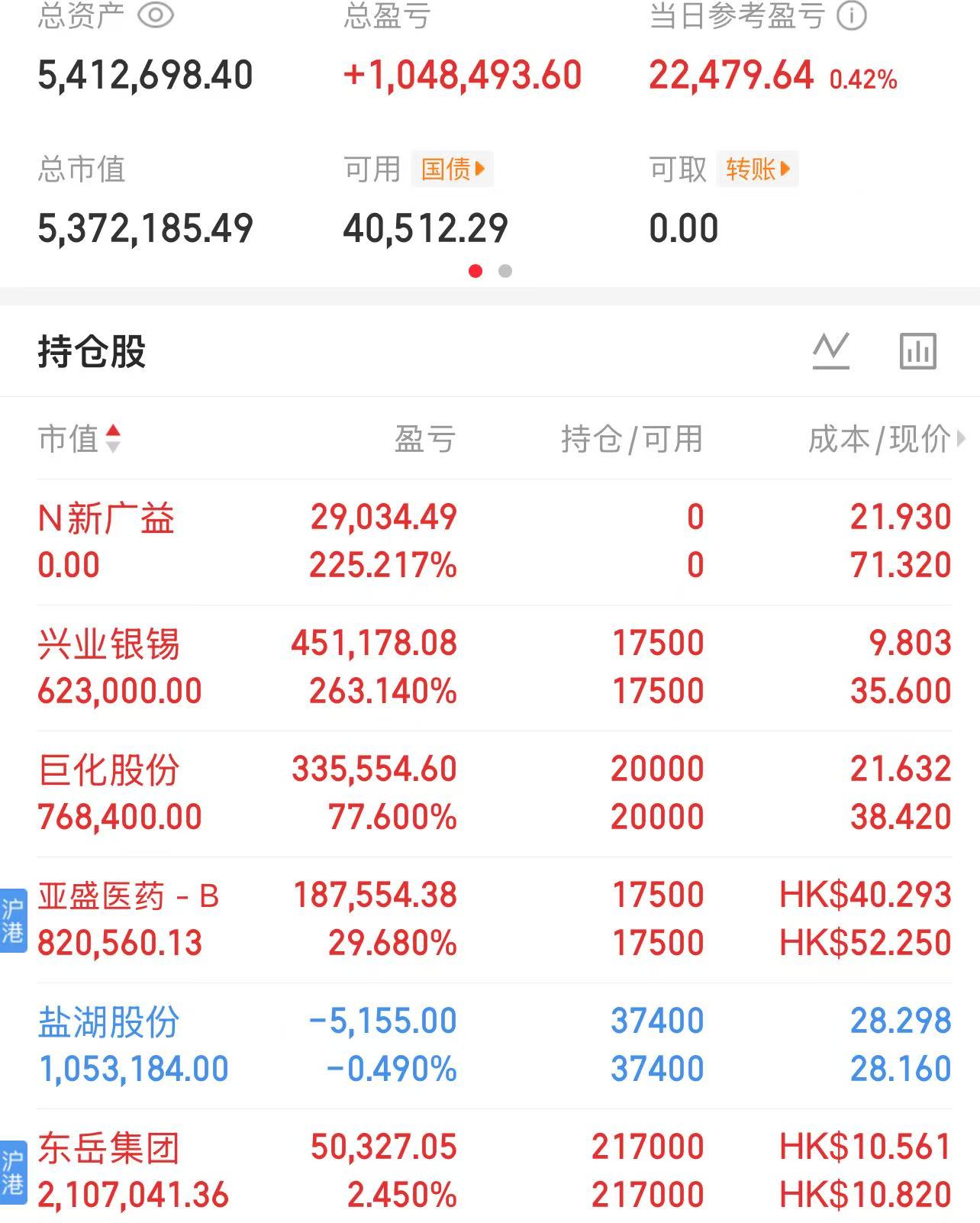 目前的持仓也没啥好说的,亚盛医药是要长期拿的,东岳可能会拿到年报或者明年的半年报。藏格和巨化准备放着用作打新的底仓,兴业随时可能清仓。
