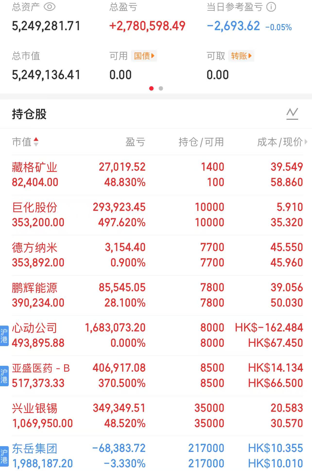 祖龙:炒股10年来亏损最为严重的一只股,巅峰时亏了近120万,元气大伤。3块多退出港股通时本来可以跑路,但头铁不信邪,最低时股价跌到仅1块,欲哭无泪。今年明年又有几款新游戏上线,目前反馈不错。考虑再持有一段时间,看看能不能借着港股牛市,突破3.2元。