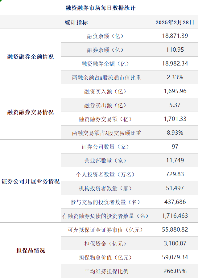 2025年2月末,融资买入金额33,030.22亿元,融资余额18,871.39亿元,融资融券账户数1449.77万户,本月新开账户数9.74万户。