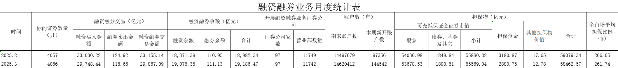 2025年3月末,融资买入金额29,748.44亿元,融资余额19,075.35亿元,融资融券账户数1,462.04万户,本月新开账户数14.45万户。