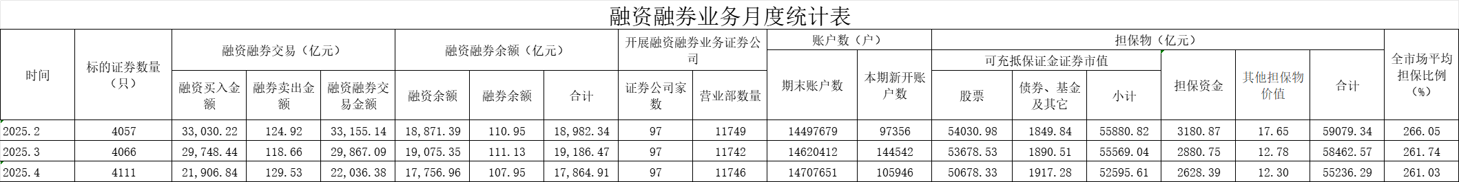 2025年4月末,融资买入金额21,906.84亿元,融资余额17,756.96亿元,融资融券账户数1,470.76万户,本月新开账户数10.59万户。