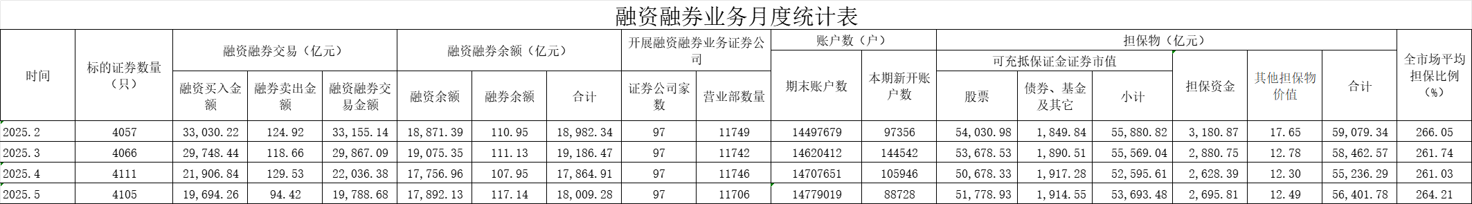 2025年5月末,融资买入金额19,694.26亿元,融资余额17,892.13亿元,融资融券账户数1,477.90万户,本月新开账户数8.87万户。