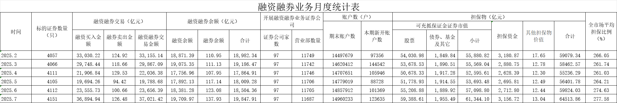 2025年7月末,融资买入金额36,894.94亿元,融资余额19,709.97亿元,融资融券账户数1,496.02万户,本月新开账户数12.36万户。