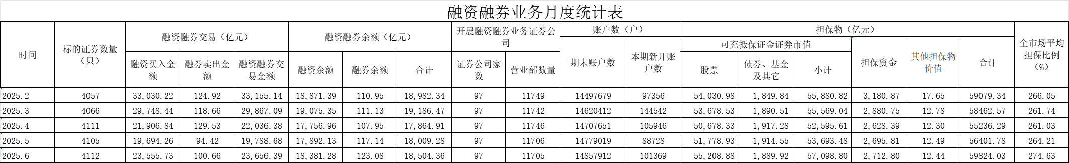 2025年6月末,融资买入金额23,555.73亿元,融资余额18,381.28亿元,融资融券账户数1,485.79万户,本月新开账户数10.13万户。