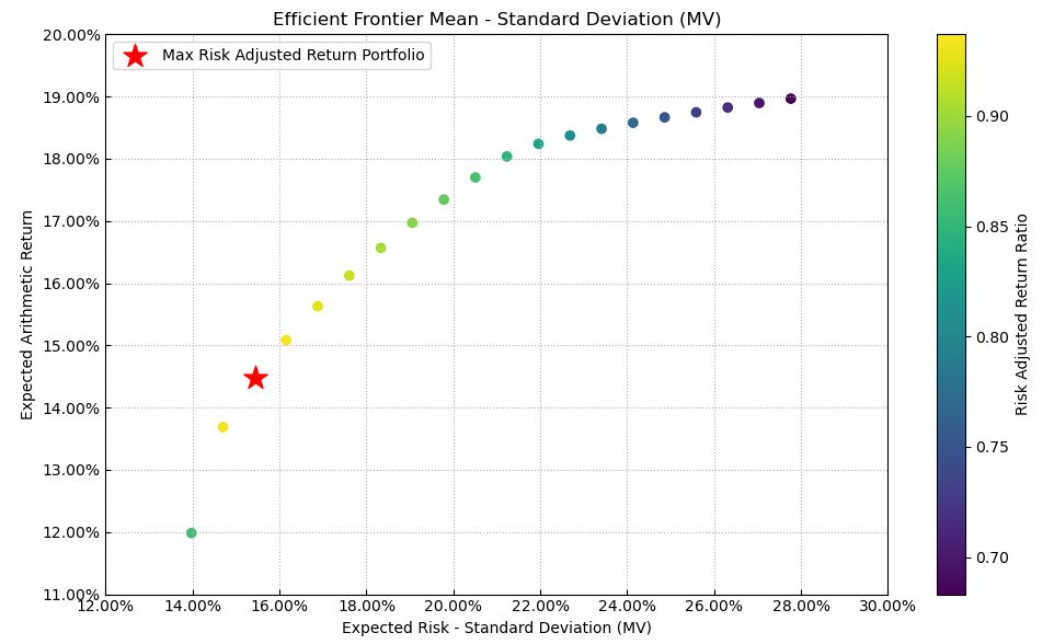 按最高夏普比率配置的话,系统给的权重为9.6%,最大权重给了美股的摩根大通占比35.5%。(注:占比越高越好)
