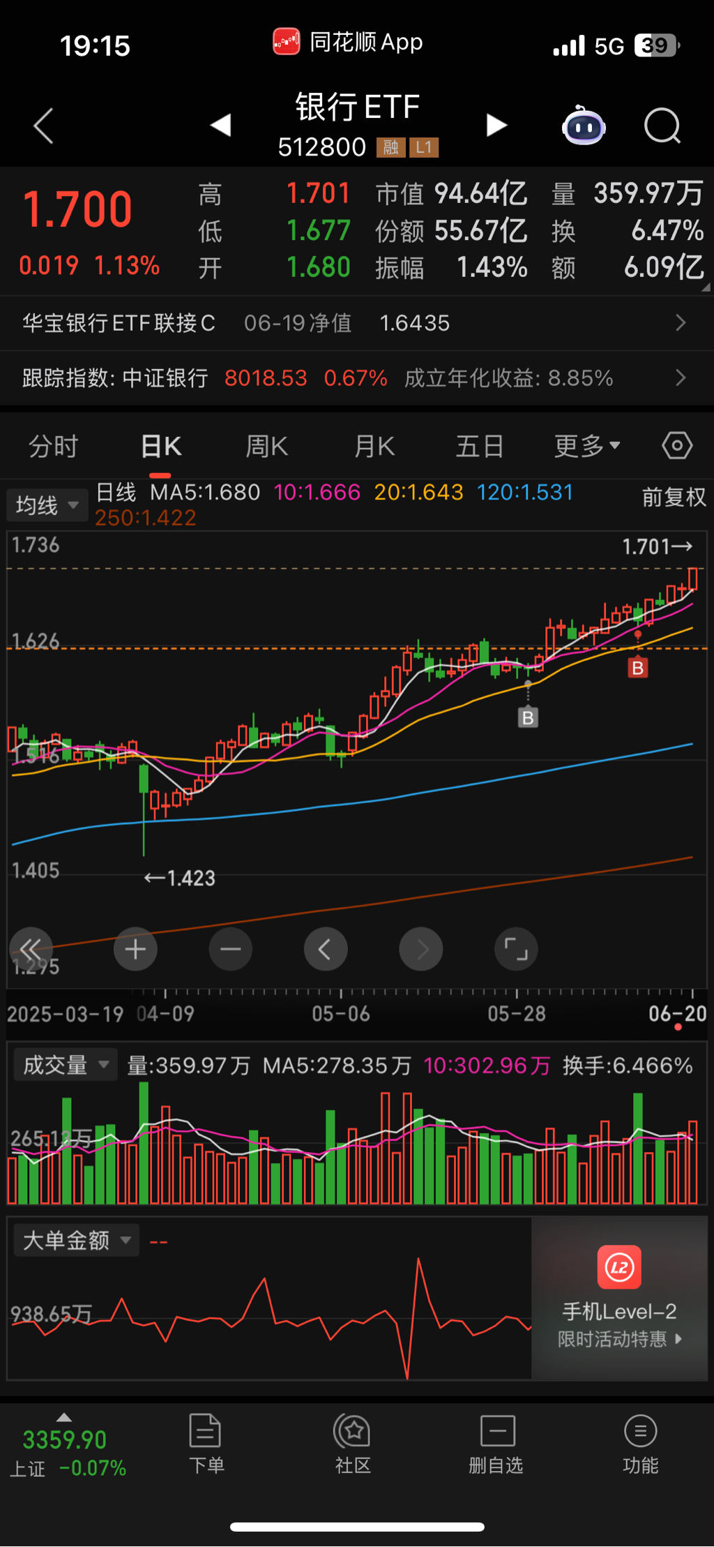 银行ETF在跌了一个点的时候清仓了,保住胜利果实,感觉银行要消停一阵。