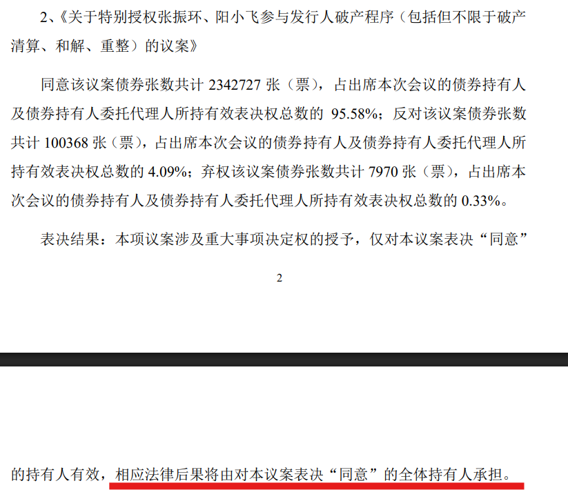 议案 2:《关于特别授权张振环、阳小飞参与发行人破产程序(包括但不限 于破产清算、和解、重整)的议案》