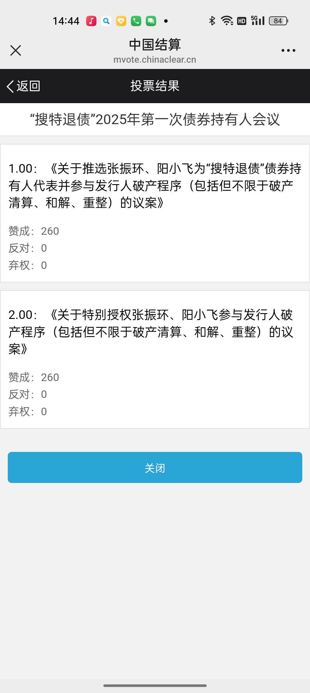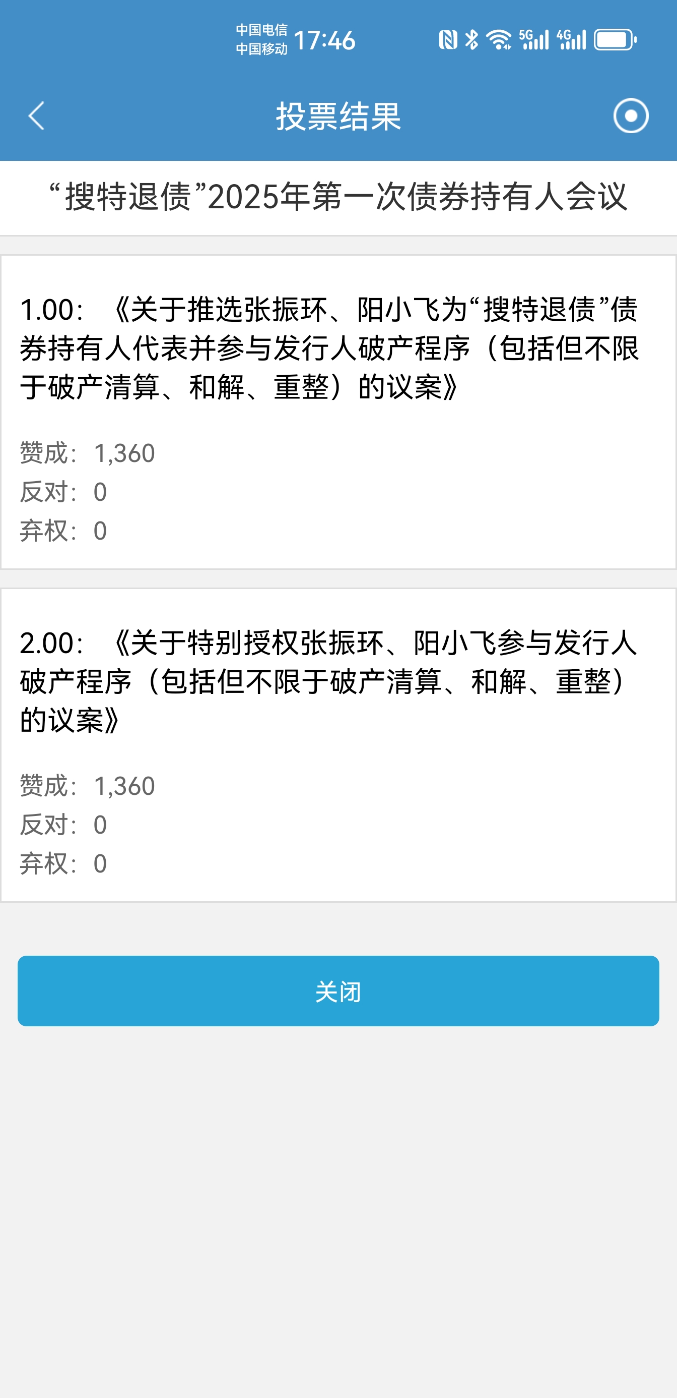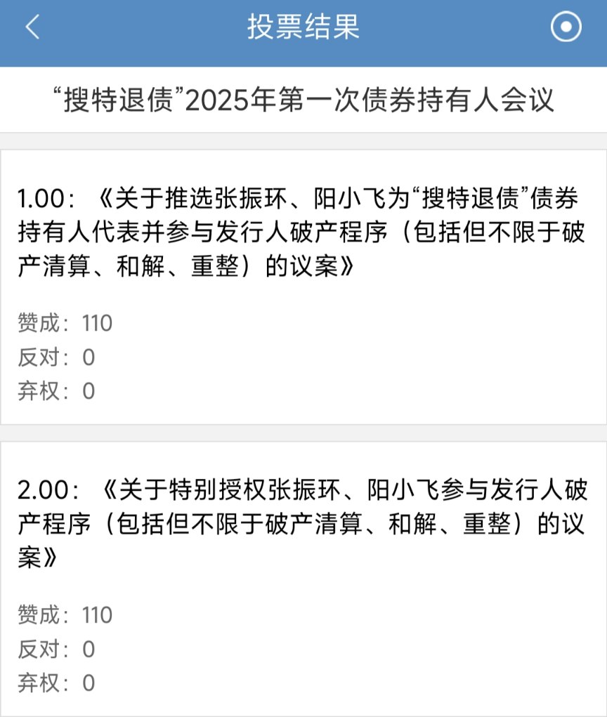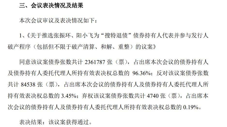 议案 1:《关于推选张振环、阳小飞为“搜特退债”债券持有人代表并参与 发行人破产程序(包括但不限于破产清算、和解、重整)的议案》