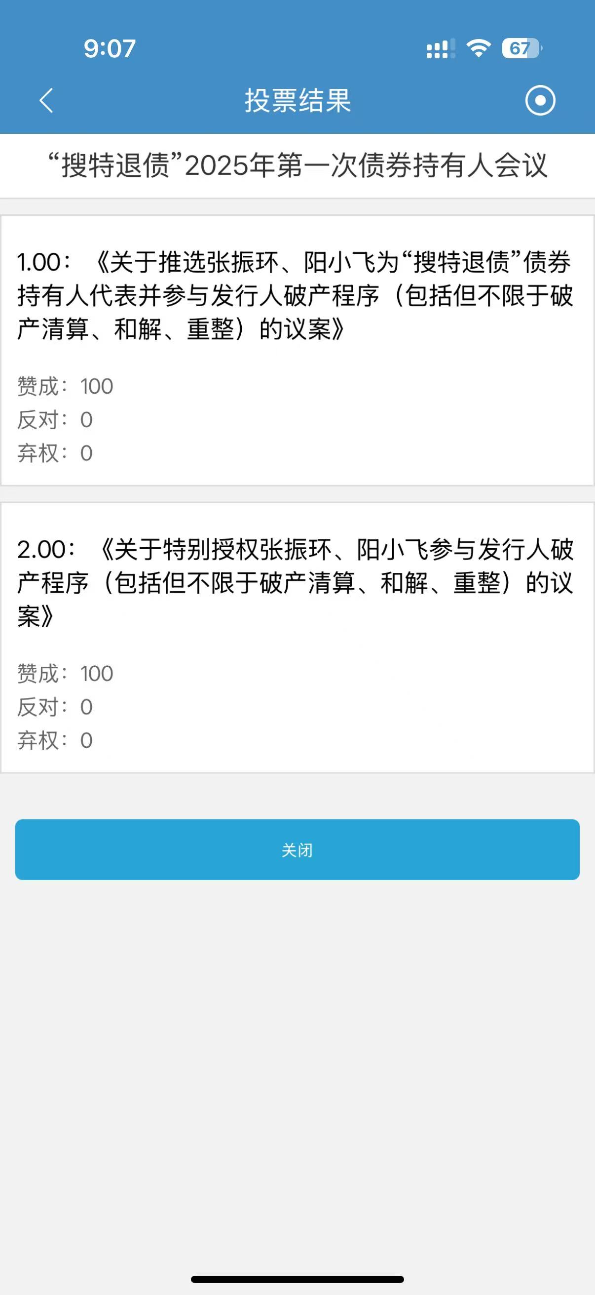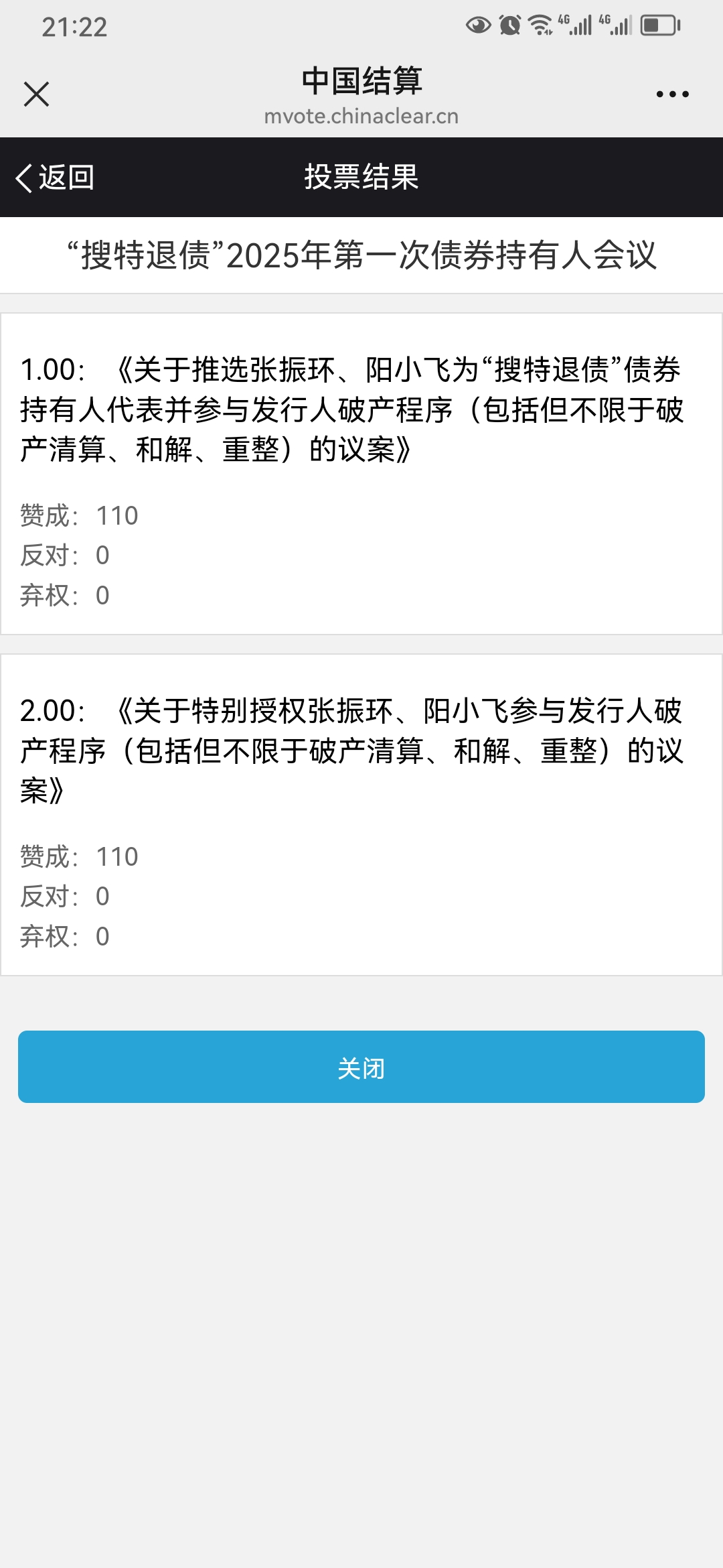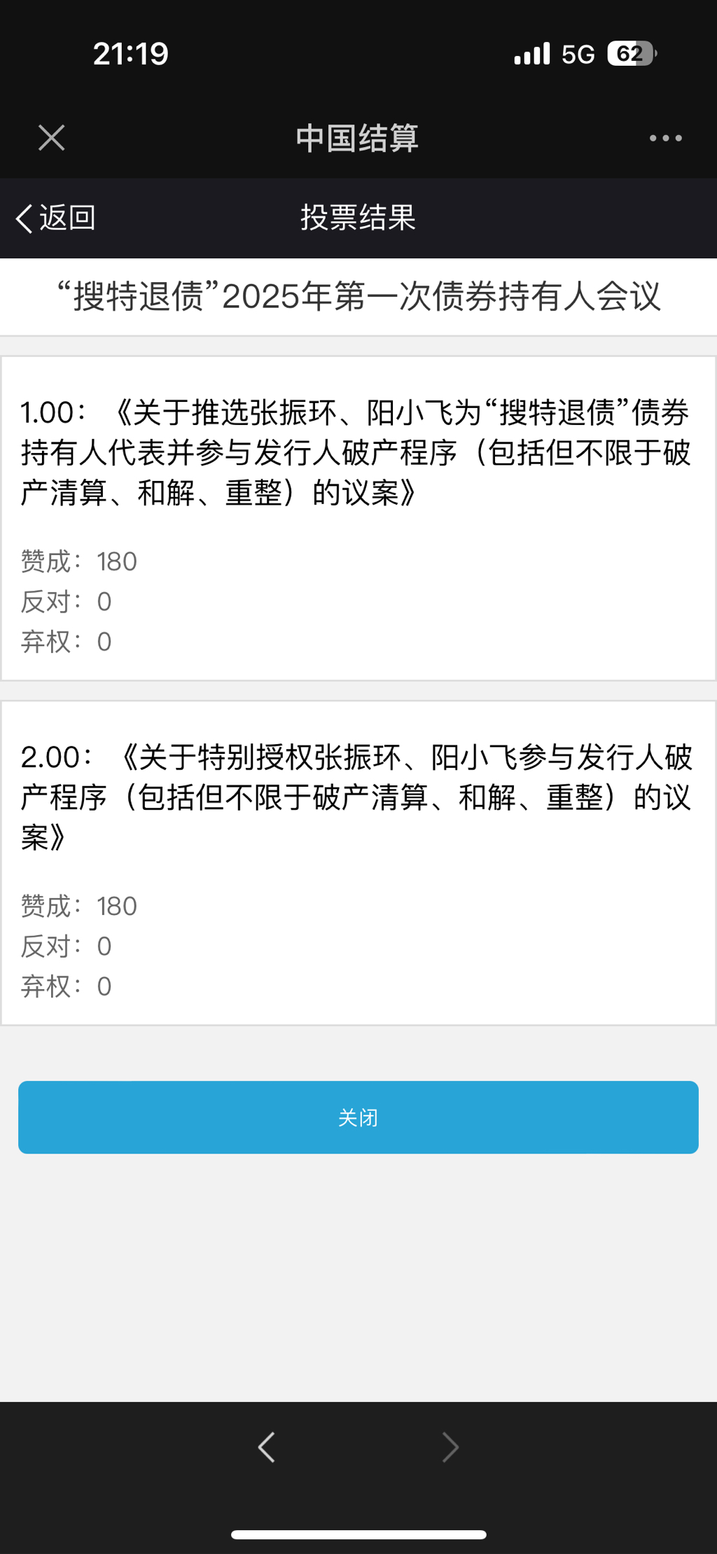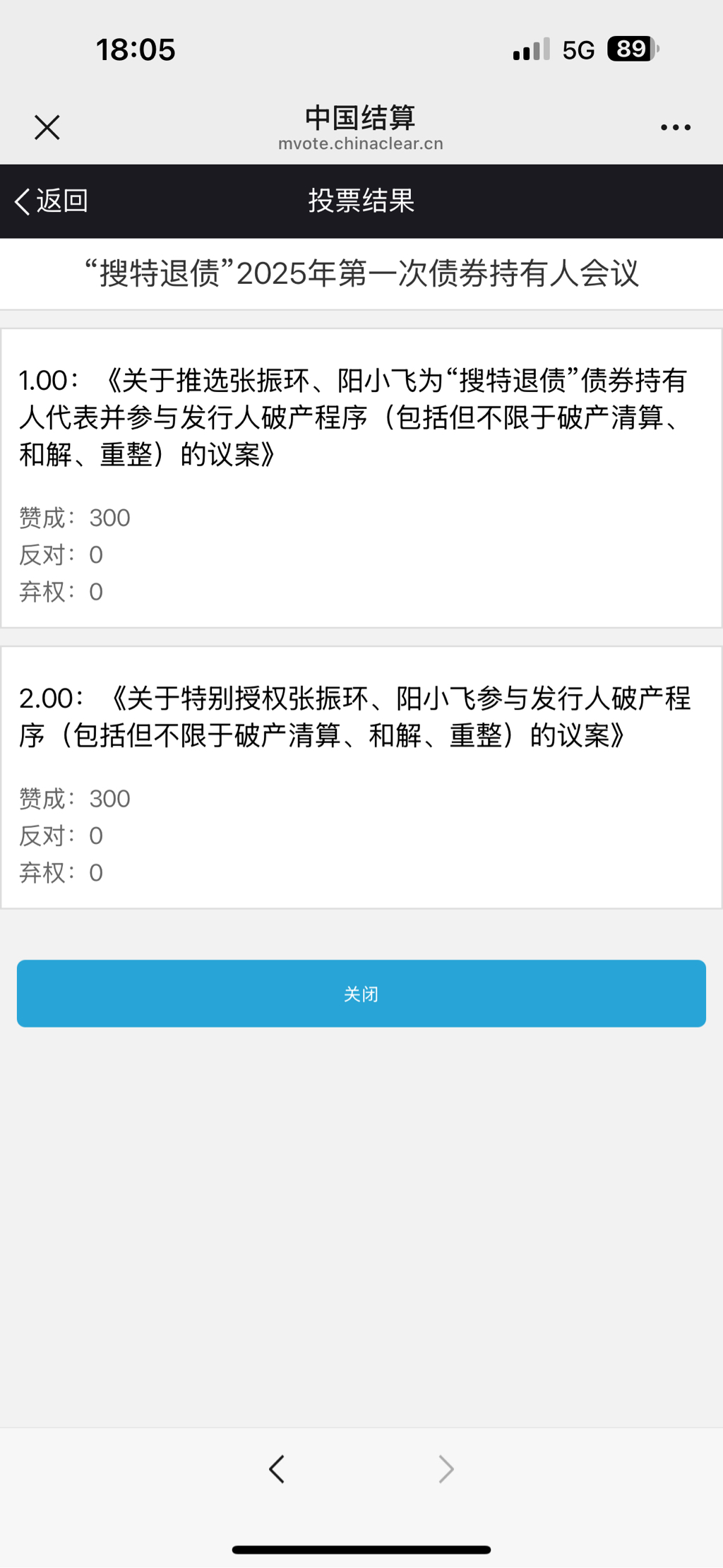 议案 1:《关于推选张振环、阳小飞为“搜特退债”债券持有人代表并参与 发行人破产程序(包括但不限于破产清算、和解、重整)的议案》
