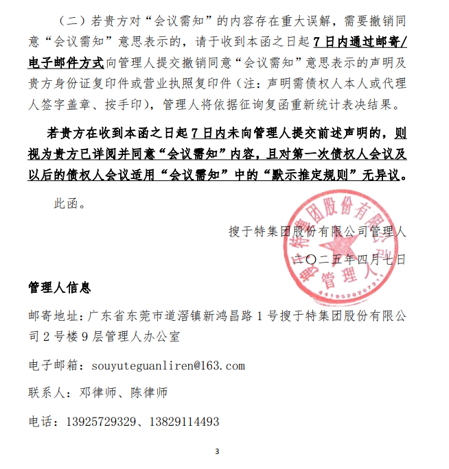 债权人您好,搜于特管理人此前已通过邮政专递的方式送达《关于搜于特集团股份有限公司第一次债权人会议需知事项征询函》,如您此前已签收管理人的书面函件或已提交声明的,不必理会本次短信。因部分函件被退件,现通过短信方式再次向您送达征询函,有关函件内容已上传全国企业破产重整案件信息网【http://pccz.court.gov.cn/pcajxxw/pcgg/ggxq?id=ED41BA84A420FD858D5F4437A9B4EE81】,请及时查阅下载。如您查收函件后对“会议需知”内容存在重大误解,需要撤销同意“会议需知”的意思表示,请按照该函件要求在期限内向管理人提交声明及相关材料。