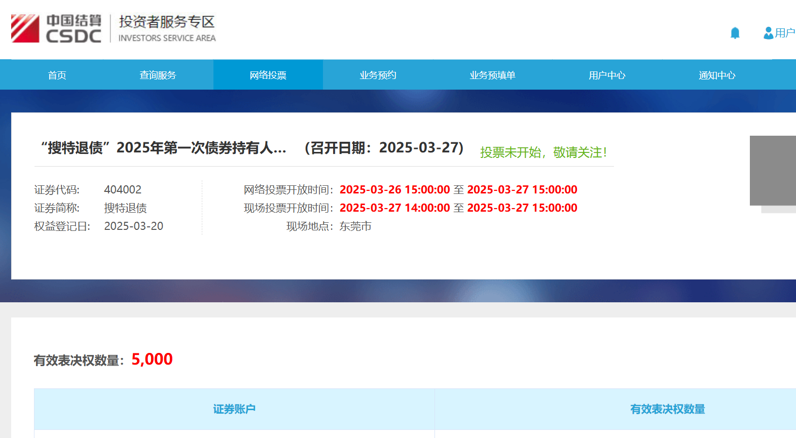投票。当然投票之前要先去中登注册账号。如果有账号的可以直接投票搜特转债3月27日持有人会议投票时间与投票方式: