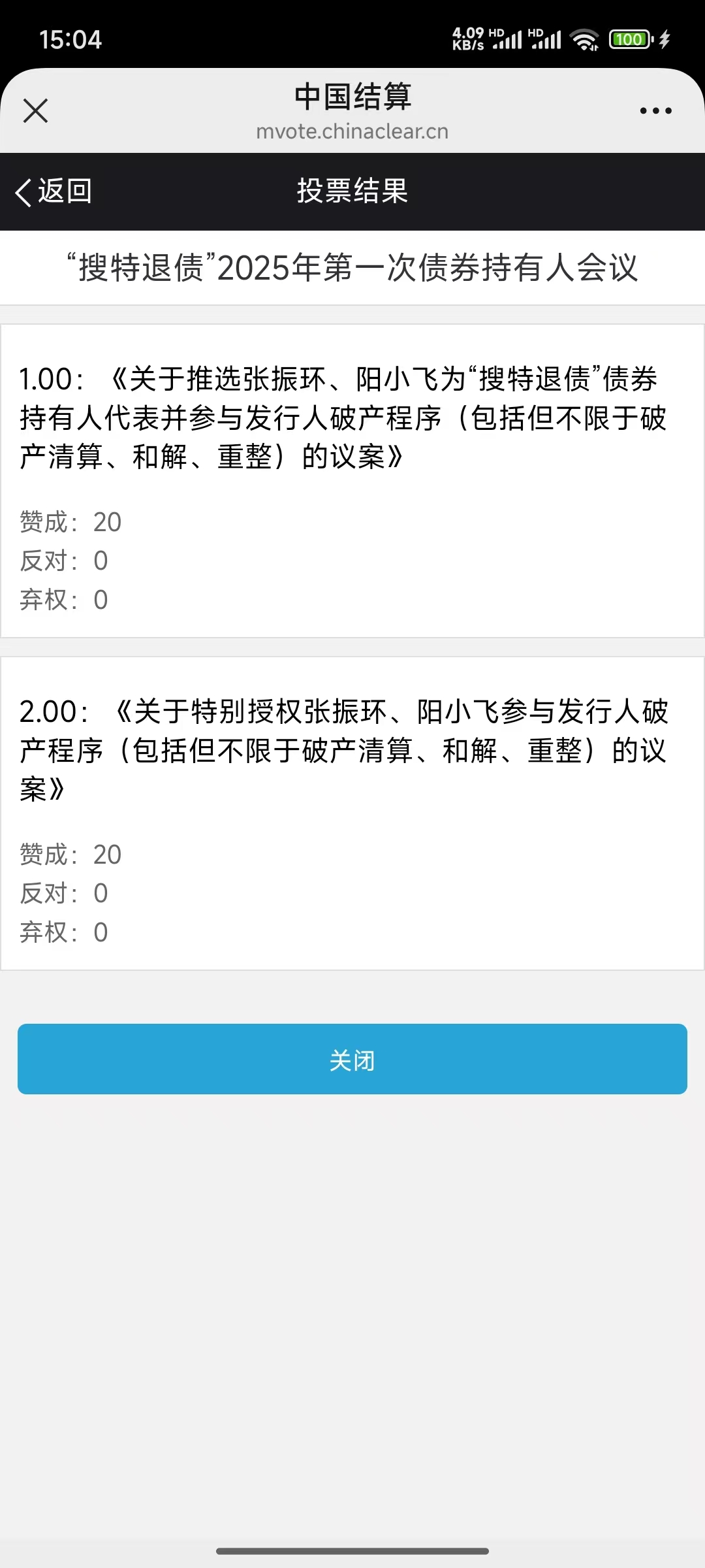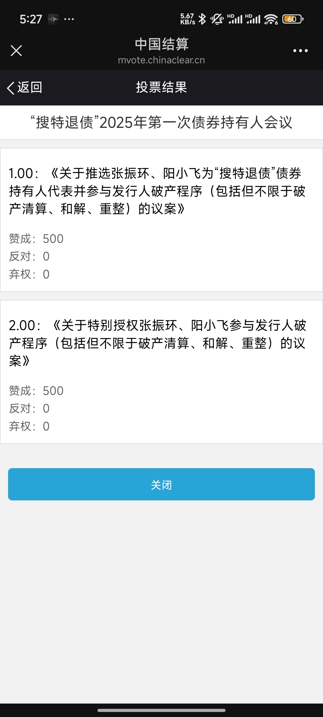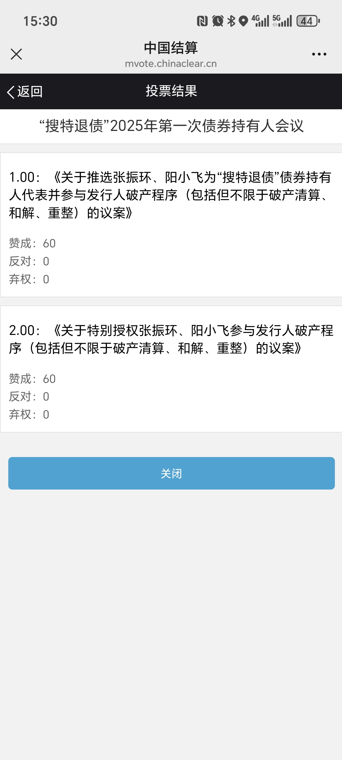 议案 1:《关于推选张振环、阳小飞为“搜特退债”债券持有人代表并参与 发行人破产程序(包括但不限于破产清算、和解、重整)的议案》