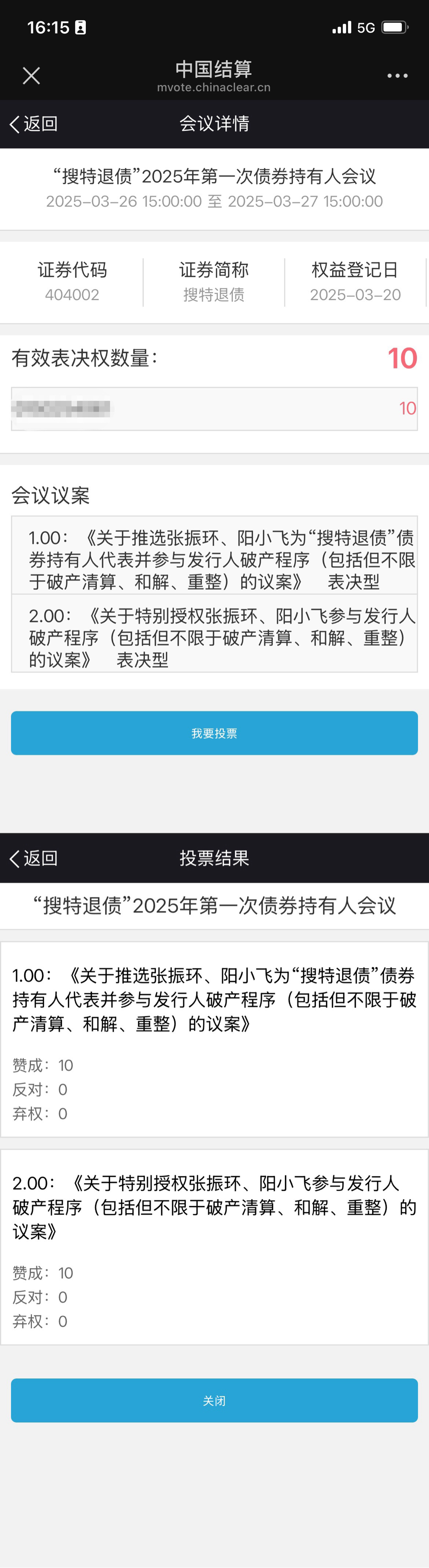 本人张振环 搜特转债10%持有人(目前已超过150人)共同信任的受委托人,他们接受了满10%持有人的委托权限不仅包含了发起搜特转债持有人会议制定并议题权限,大家同样把 搜特转债持有人会议投票表决权、搜于特破产债券会议发表意见代理投票等重大权限授权给这两位代表,张振环依据这套委托书 曾在一债会代表委托人集体表决(但人数毕竟有限)。