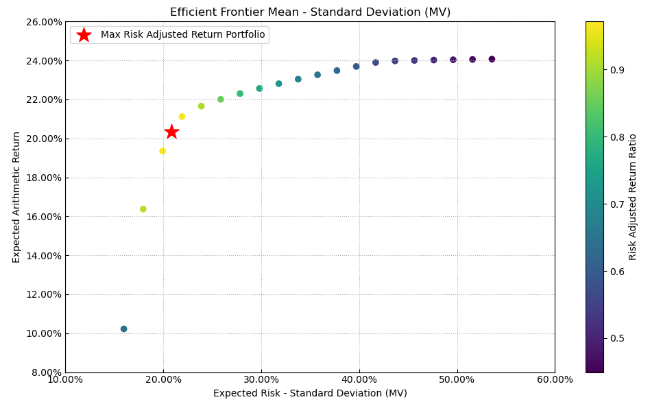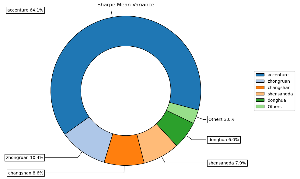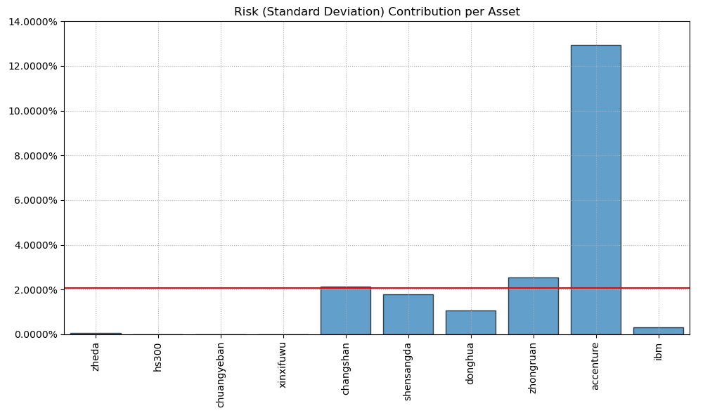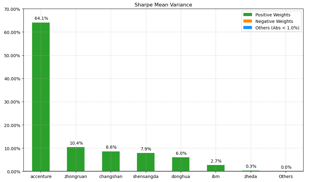 按最高夏普比率配置的话,系统给的权重趋于零,最大权重给了美股的埃森哲占比64.1%。(注:占比越高越好)