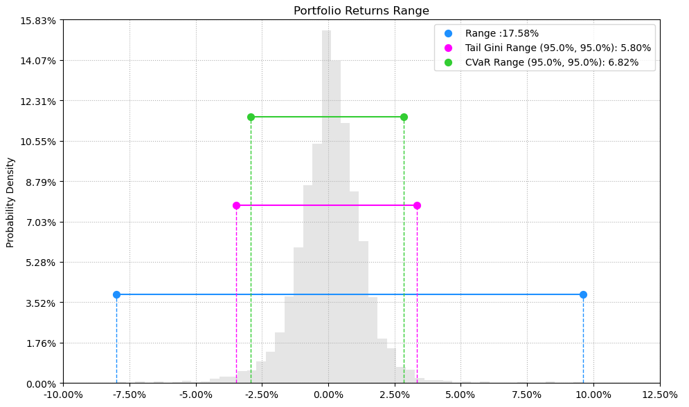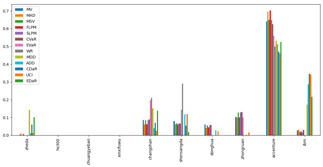 最后看下整个投资组合的情况,日度均值回报在0.07%,比上次测的电子设备行业低20%,不过6.82%的CVaR波动也会小一些。(注:均值回报看Mean那一栏,越高越好;CVaR波动看CVaR那一栏,越低越好)