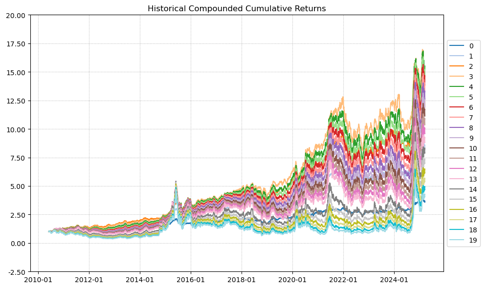 区间累计回报近12倍,最大回撤31.36%,投资组合的整体表现远好于浙大网新个股。整个信息服务行业盈利能力不错,波动中低,夏普比率0.98也还行。(注:累计回报看Cumulative Returns那一栏,越高越好;最大回撤看Maximum Drawdown那一栏,越低越好)