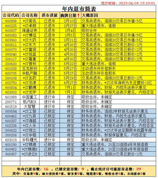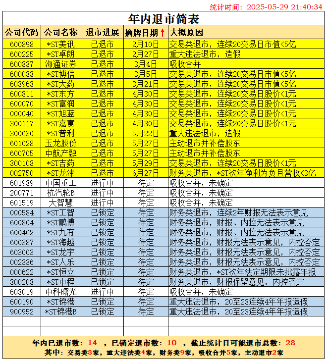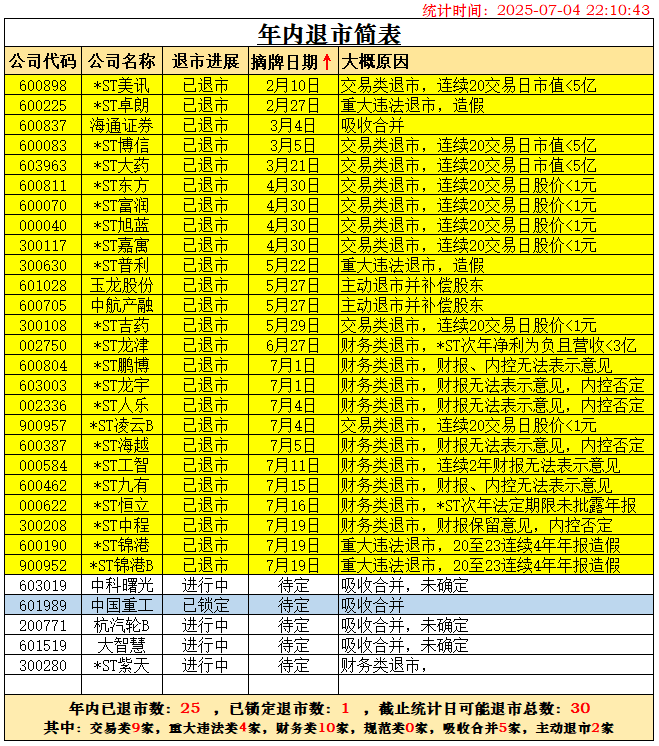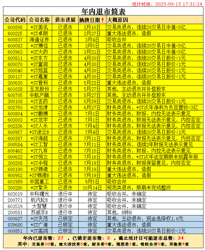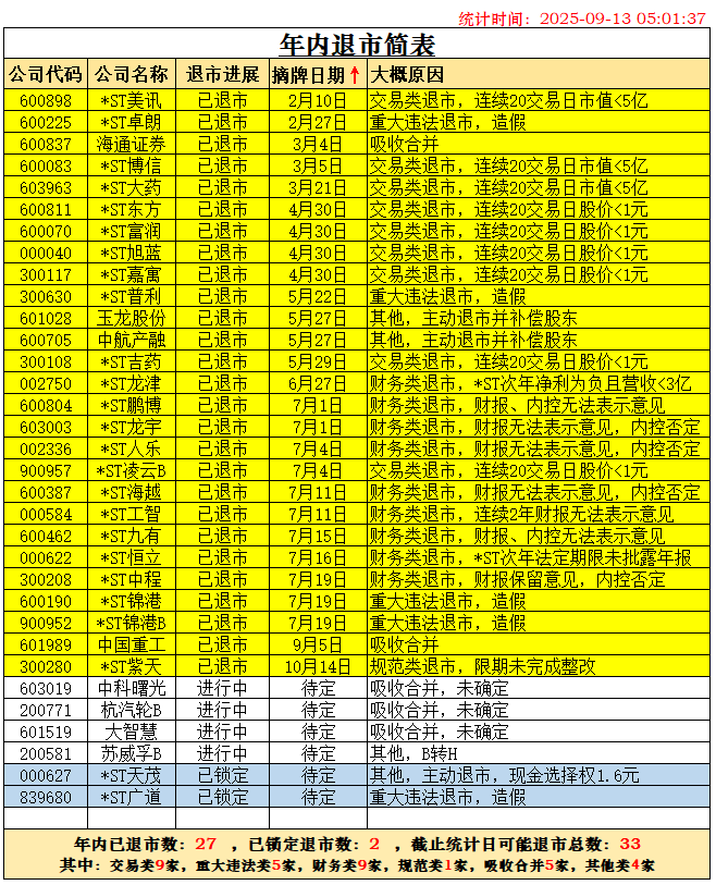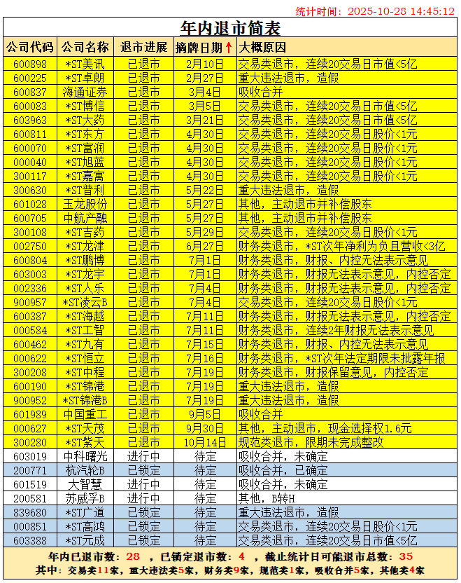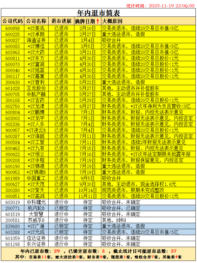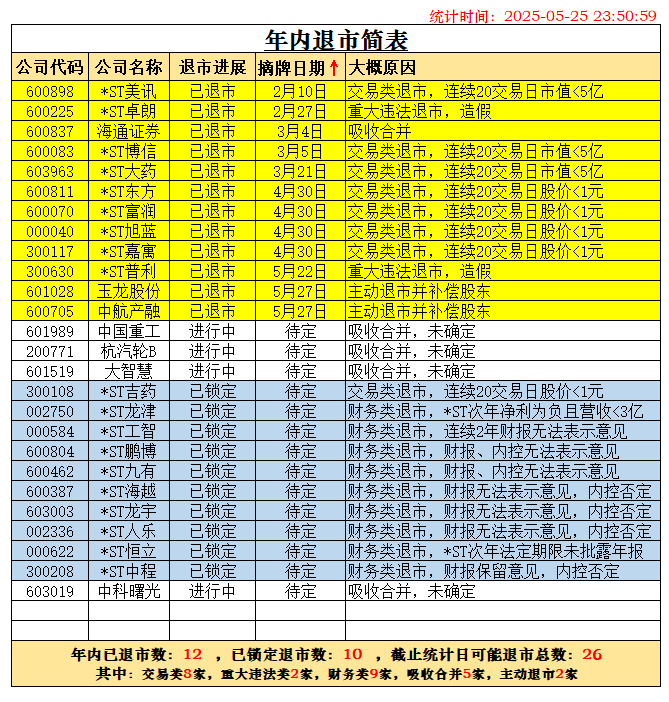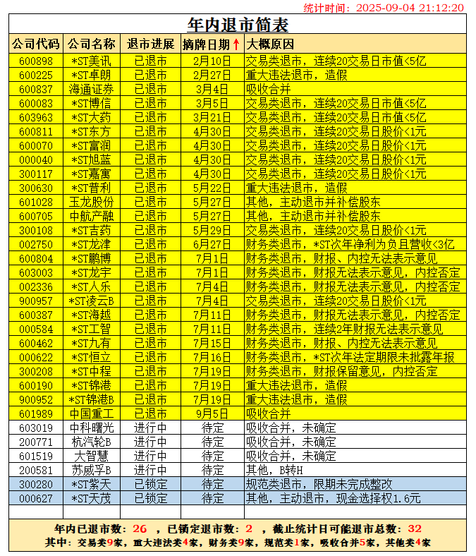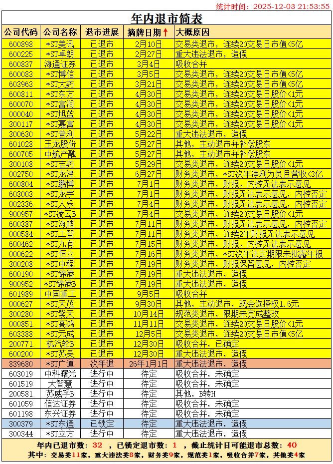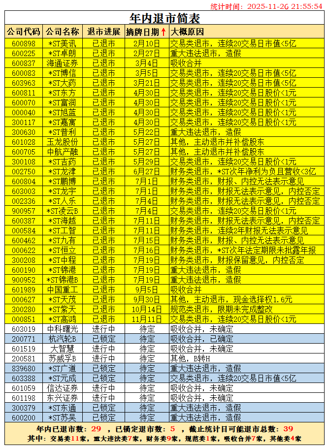 随着杭汽轮B退市已被深交所受理,根据历史经验,28天内摘牌退市可以确定。两家锁定退市的公司*ST广道确定于2026年1月1日摘牌,*ST东通退市也确定在2026年摘牌了,二者都不能计在2025年退市之数。